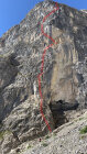2. SL: Achtung, es geht nicht die riesige Prachtverschneidung hoch (das ist "Diebstahl", man kann aber vom oberen Ende der Verschneidung leicht auf die Route nach R zurück). Stand ist oben auf Pfeilerkopf. Die Route hat Bh mit weiten Laschen, einige davon sind golden, andere sehr grau.