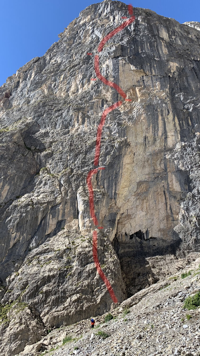 B: ca. 30 m abseilen und W halten/pendeln/klettern. Man kommt an einen Abseilstand (Karabiner, 2 Bh). Von dort ca. 30 m W haltend runter. Am Überhang keine Exe einhängen, sonst kommt man nicht weit genug nach W. Dort Abseilstand an einer Art flacherem Pfeiler. Von dort auf ein klares Rasenband runter (50 cm breit, mehrere Meter lang. Am W-Ende des Bandes ist wieder Abseilstand. Von dort 47 m runter zu Flachstelle mit Abseilstand. Passt perfekt, und von dort in 30 m zum Wandfuss. Abziehen jeweils unproblematisch. Wenig Schuppen in der Wand, an denen was verhängen kann, aber die Stände im oberen Teil muss man schon finden. Die Variante C ist eventuell effizienter... vielleicht hat jemand Erfahrung?