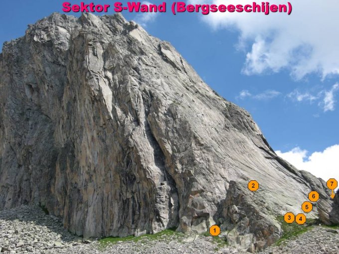 Von der Bergseehütte in 30 Minuten zum Einstieg. Blau Weiß markierter WEg, später Steinmänner zu der Südwand.