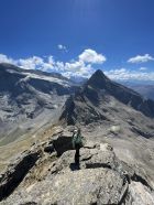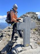 Vom Vorgipfel aus weiter über den Grat klettern im 3. Grad, der aus grossen Blöcken besteht. Vor dem Gipfelkreuz ist ein feingestufter Aufschwung von 8m Höhe, 4er Stelle zu erklettern. Dieser kann mit einem Friend 1 gut abgesichert werden, ca. 1 h. vom Vorgipfel zum Gipfelkreuz. .