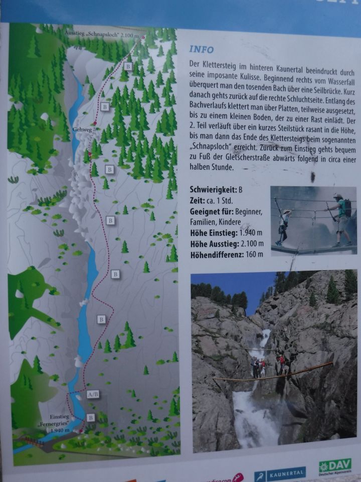 Der 240 m lange Klettersteig durch die südöstlich ausgerichtete Schlucht des Rifflbaches wurde 2013 gebaut. Inzwischen wurden Fixpunkte und das Stahlseil erneuert. Letzteres hat nun einen Durchmesser von 14 mm. Die Seilbefestigungsklemmen sind mit schwarzen Kunststoffmanschetten überzogen, um sie im Nass-Bereich vor Rost zu schützen. Ursprünglich gab es den Einstieg mehr rechts und über den Felsen hinauf. Nun überquert man auf erster Hängebrücke den tosenden Sturzbach. Die Brücke besteht aus 3 längs miteinander mittels Scharnier verbundenen Holzbrettern und jeweils einem Handlaufseil jeweils rechts und links. Über die von Wasser und Gletscher glatt geschliffenen Felsstufen steigt man auf Reibung und an wenigen V-förmigen Eisenbügeln hinauf zur oberen Seilbrücke gleicher Bauart. Wegen der Gischt des Wassers ist der untere Felsbereich oftmals pitschnass und mit einem schmierigen Staubfilm überzogen, was die Reibung und den Halt erheblich verschlechtert. Hier ist darum besondere Vorsicht geboten. Nach 2. Hängebrücke klettert man steil über eine Felsstufe und trifft auf eine Seilverzweigung. Von rechts über trockenes Felsgelände kommt hier der frühere KS-Teil an, eine Alternative, wem die untere Schlucht-Passage zu nass ist. Danach quert man auf einem schrägen Band nach links zum Bach hin. Dann auf massiven U-förmigen Eisenbügeln geht es senkrecht nach oben. Es folgt ein Stück ungesichertes Gehgelände, wo Steinschlaggefahr in zu traversierender Felsrinne besteht. Danach klettert man eine steile Wand rechtshaltend auf V- und U-förmigen Eisenbügeln hinauf und entfernt sich somit vom Bach. Bei einem Metallkreuz an rotbrauner, etwas überhängender Felswand folgt die letzte steile Bügelreihe hinauf. Danach lehnt sich das Gelände zurück an unscheinbarer, teils bewaldeten Felskuppe („Schnapsloch“). Das Seil endet an einer Fichte (1¼ Std.), an der sich box für das Steigbuch befindet. Etwas rechts daneben befindet sich der höchste Punkt der Kuppe (2100 m). Von hier erblickt man den Gepatsch-Stausee über seine Ausdehnung vom Südufer bis zur nördlichen Staumauer. Im Süden sieht man das Gletschertor, wohin der Gletscher-Naturlehrpfad führt. Und zu dem man absteigen könnte (Rundweg von 2 Stunden mehr).