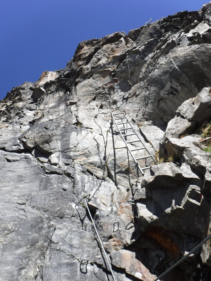 Gegenwärtiger Hüttenwart M. Dobler aus Schusslehn, St. Leonhard pflegt den 100 m langen südlich ausgerichteten Steig über 80 Hm und diesen Klettergarten. An einem Felsblock beginnt das 14 mm dicke Stahlseil, welches vorherige dünnere ersetzt. Ebenso wurden die Ankerpunkt erneuert und mit kürzeren Abständen zu einander eingebohrt. Nach der Rechtsschräge geht es gerade hoch zu einem Felsvorsprung. Dann halbrechts auf einen Block. Danach hoch uns links querend zu der 9-sprossigen Stahlleiter, welche man schon von unten sieht. Nach dem kurzen Überhang (schwierigste Stelle) führt das Seil in rechte obere Flanke und dann über das sich zurücklehnende Schrofengelände auf das kleine Plateau der länglichen Felskuppe. Vor kleiner Steinpyramide (2907 m) endet das Seil (15 min.).