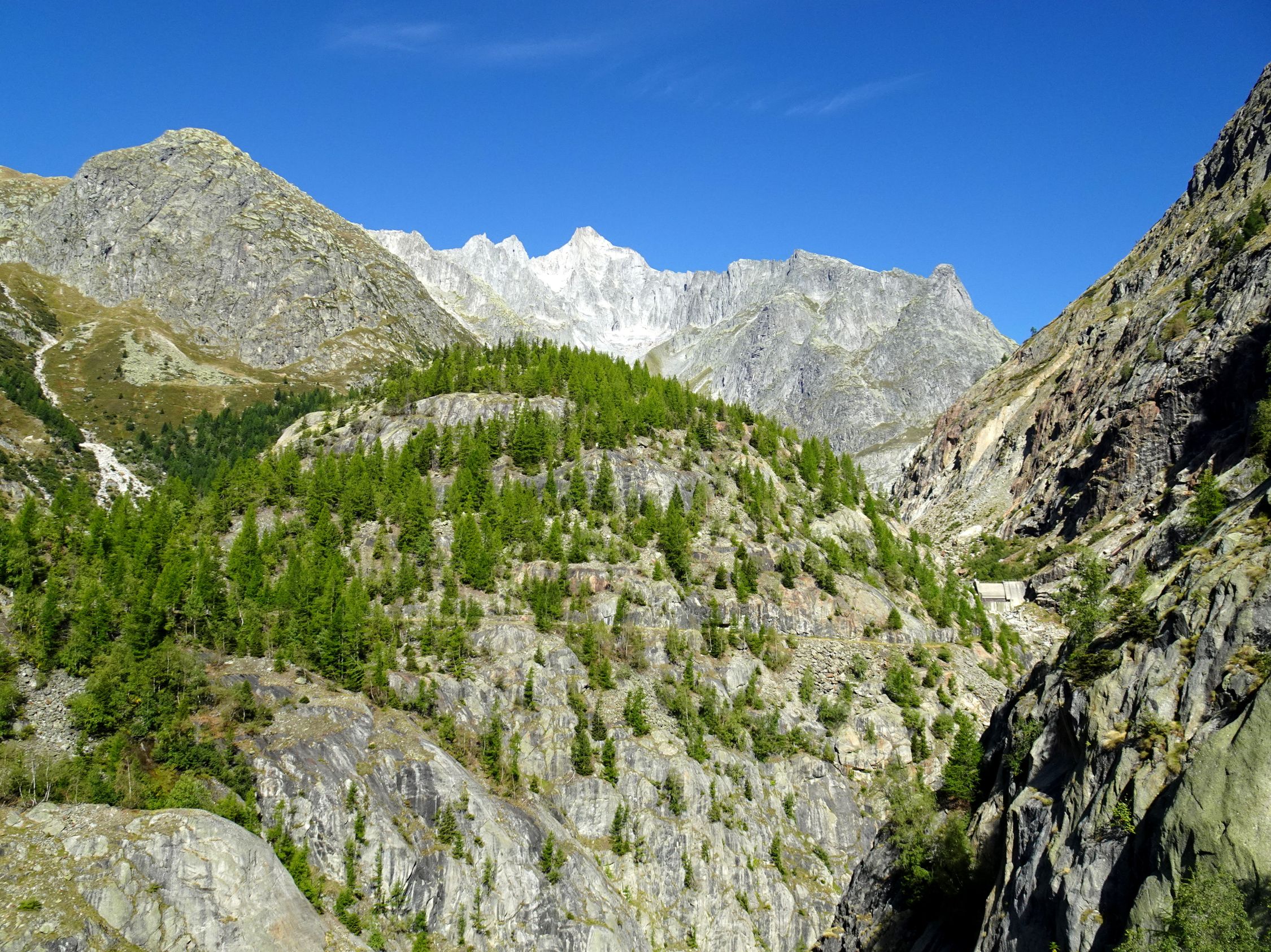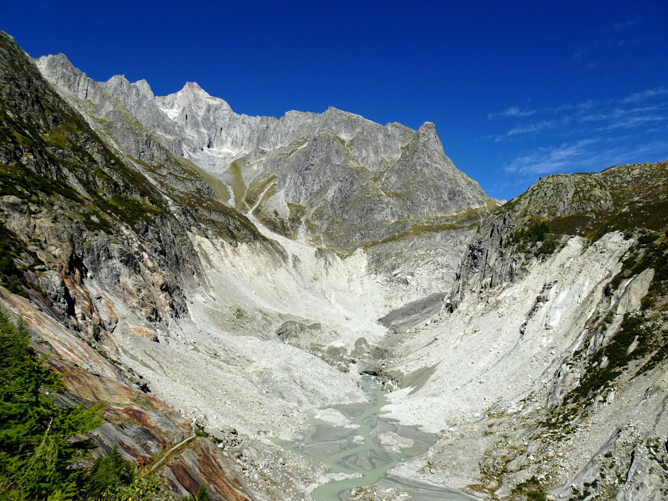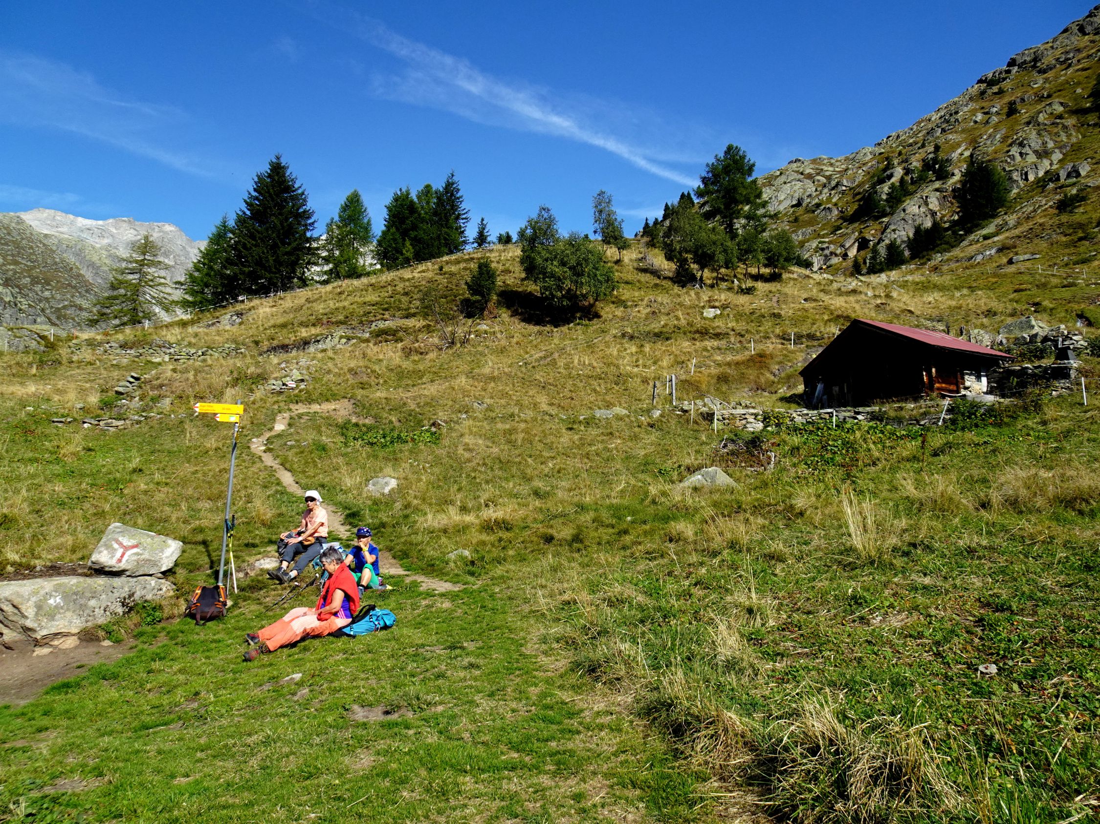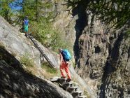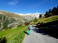 Rückweg: Knapp unterhalb der Hütte bei Wegweiser kurze Metalltreppe die in die Schlucht leitet. Nun steil hinunter bis auf den Boden von Titter- Unnerbärg. Man folgt nun der Forststrasse bis zur Asphaltstrasse hinunter, weiter neben dem Kraftwerk bis zur Posthaltestelle Fieschertal Dorf und nach Fiesch.