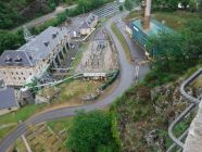 Durch das grüne breite, zweiflügelige Eisentor läuft man ca. 200 m an der Gasanlage und der NH3-Anlage rechts und am Freiluft-Umspannwerk links vorbei zum Schräg-Viadukt. An rechter Seite vom gemauerten Viadukt hoch zum Einstieg (2 min.).