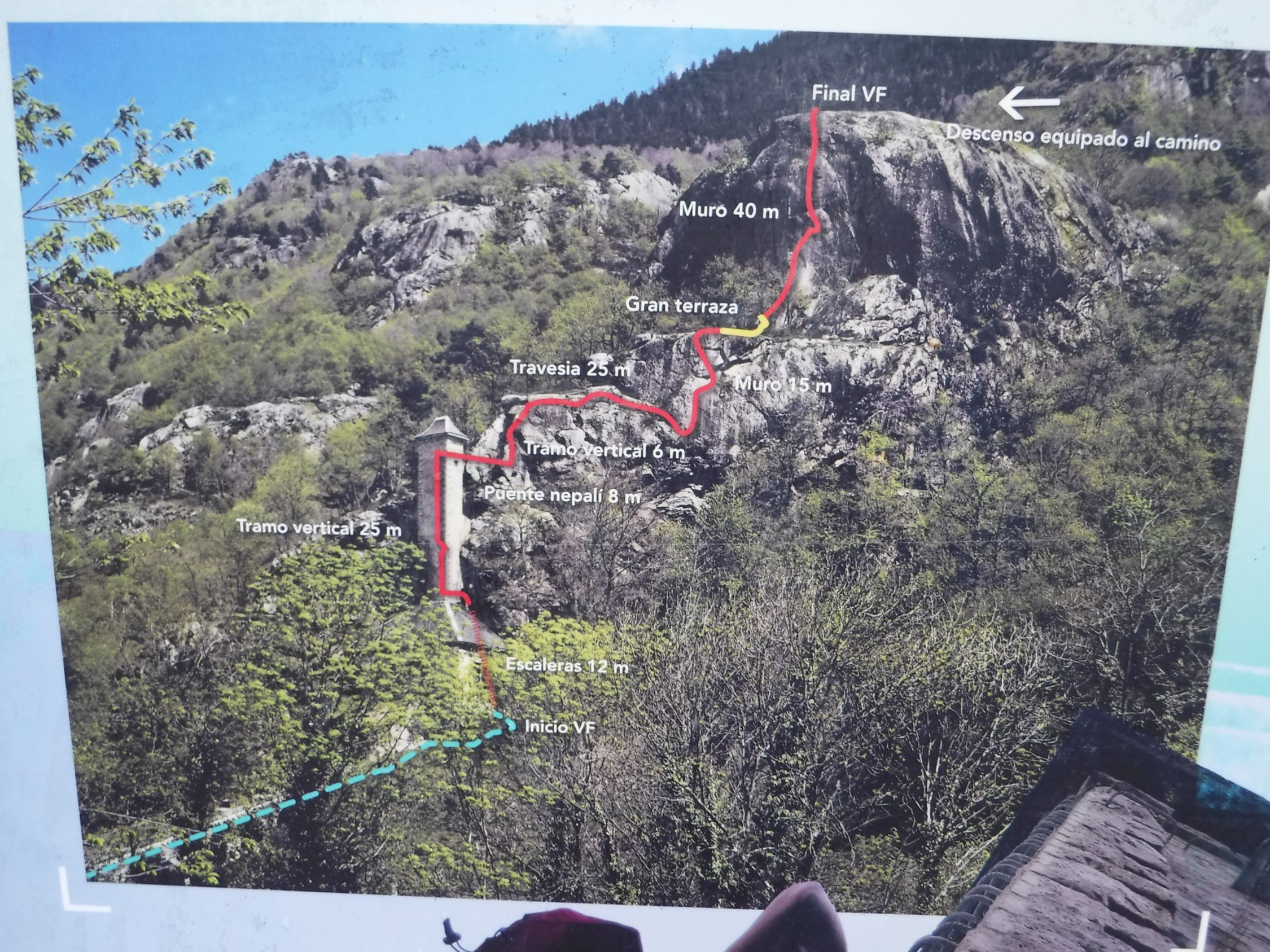 Der 250 m lange Klettersteig über 80 Hm wurde von der Escola de Muntanya ECEM im Jahr 2015 gebaut und von ihr in Schuss gehalten und kontrolliert (www.ecemescolademuntanya.com). Mit EU-Geldern wurde dieser interessante Steig z.T. finanziert in Verbindung mit touristischer Erschließung des ehemaligen Elektrizitätswerkes. Eine Infotafel über den Klettersteig befindet sich vor dem Schrägviadukt. Der Zustieg führt über das schräge Steinviadukt, auf dem einst die 2 Wasserrohrleitungen verliefen. Am oberen Ende des Viadukts steht der 35 m hohe viereckige Turm ehemaliger Wasserkraftanlage. An dessen hinteren rechten Seite beginnt man mit einer 65° schrägen 18-sprossigen Eisenleiter links vom Edelstahlseil zwischen rechter Felswand und linker Turmmauer. Die Fixpunkte des Seiles sind ebenfalls aus VA und haben die „Schweineschwänze“ am Ende, wie man sie aus französischen Sportsteigen kennt, um darin für Nachsteiger ein zusätzliches textiles Sicherungsseil einfädeln zu können (Seilumlenkprinzip), und der Nachsteigende dieses wieder einfach herausbringen zu können. Die Leiter endet an verschlossener Turmtür im Türbogen. Von dort führen die Eisenbügel und das 14 mm dicke Stahlseil nach links um die SW-Ecke des Turms hinauf, um danach unterhalb des Turmdaches wieder um 90° die Turmseite nach rechts zu wechseln. Dort schließt sich eine 8 m lange 2-Seil-Brücke mit zusätzlichem Sicherungsseil darüber an. Diese führt zum grauen Granitfelsen und dort hinauf zu seinem Grat, welchen man nach rechts ca. 25 m lang quert. Danach steigt man in eine Nische ab und es beginnen 2 südwestlich ausgerichtete Felsstufen. Diese durchquert man unschwierig hinauf zu einer Felsterrasse. Von dort geht es eine 40 m hohe Felswand steil hoch. Das Seil endet am Aussichtpunkt neben dem Holzgeländer steht eine Panoramatafel (30 min.). Von hier blickt man hinab auf den Ort Les.