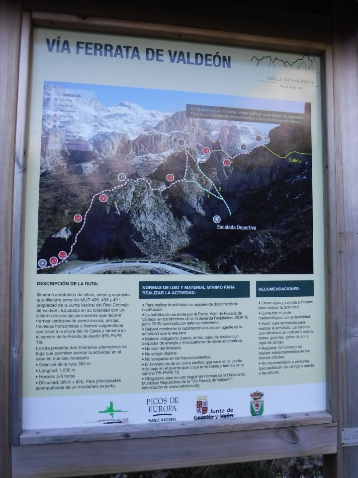 Zurück zur Pension El Tombo. Rechts an deren Terrasse und an einem Brunnen links in dortiger Rechtskurve vorbei läuft man nordwärts hinab in Richtung Schlucht des Rio Cares. Nach einer Linkskurve und vor der Straßenbrücke über den Fluß biegt man jedoch rechts in einen Betonplattenweg ab (Wegweiser: El Molino). Rechts vorbei an einer Wasseranlage beginnt ein unbefestigter Fahrweg an rechter Uferseite des Río Cares, der nach 300 m bei einem größeren sonnigen Parkplatz in einer Wendeschleife endet. Bei einer Informationstafel über die Wanderwege verlässt man den Fahrweg und wandert auf einer Holzbrücke (780 m) über den Fluß und läuft nordwärts bergauf zu einem dunkelgrünen Wegweiser an der Teerstraße. Auf gegenüberliegender Straßenseite (Zebra-Streifen auf der Straße) befindet sich der Aussichtspunkt Mirador del Tombo La Pandiella (830 m, 15 min.). Dort steht eine hohe Seinsäule betoniert mit Felssteinen. Oben thront eine Gams aus Bronze. Davor steht auf einem Felsstein ein kleines, vierseitiges, gusseisernes Kreuz von 1964. Von hier folgt man dem grünen Wegweiser V.F. de Valdeón, bzw. Caín a Pie wieder zur Teerstraße weiter. Wenige Meter danach zweigt beim Wegweiser am rechten Straßenrand der Wanderweg, bzw. Zustiegsweg zum Klettersteig ab. Auf diesem ca. 650 m bergab wieder zum linken Ufer vom Río Cares (10 min.). Rechts neben der Hängebrücke über den Fluß beginnt der Klettersteig (790 m). Bei den beiden Infotafeln über den Klettersteig seilt man sich an.