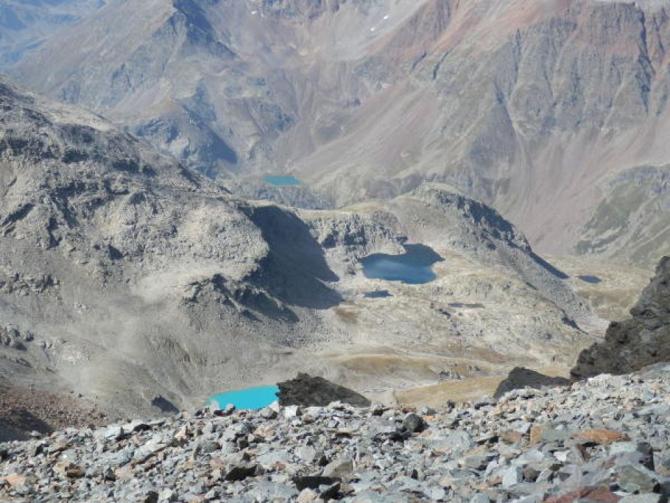Auf der Passhöhe über Wiesen udn Matten Richtung Osten in den Kessel unter der Cima de' Piazzi, wo es einen neuen, blitzblauen See gibt. Man quert den kleinen Bach, der von links herunterkkommt an der seichtesten Stelle. Nun leicht links haltend in den grossen Schuttkessel den Wegspuren nach bis unter die von links gesehen 2. Rinne im Felsriegel. Dort kann man die Steilstufe unschwer durch ein Couloir überwinden. Nun über den Schutthang bis zum breiten Gratrücken und weiter auf den Gipfel. Kein Eisberührung, die letzten Meter sind in leichter Ketterei zu überwinden (2). Text übernommen Eintrag Gipfelbuch 10.9.2012!