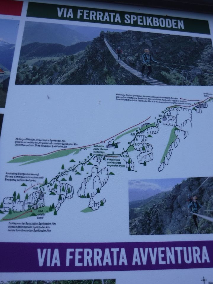 Beim Wegweiser hält man sich geradeaus zum nahen Restaurant Speikboden (2000 m), bzw. der Michelreiseralm daneben. Auf gut ausgebautem Kiesweg (Wanderweg Nr. 27) läuft man südwärts unsteil an einem kleinen Sielplatz und Tümpel links vorbei in 10 min. hinauf bis zur Weggabelung (Wegweiser). Nach rechts biegt dort der Wanderweg Nr. 18A ab, bzw. der Zustieg zum Kinder-Klettersteig Via ferrata die Bambini. Nach links hoch beginnt der Aufstieg in südwestliche Richtung. Nach 5 min. biegt rechts der Wanderweg Nr. 18C zum Speichersee ab. Man bleibt auf rotweiß signalisierten Bergweg Nr. 27. Dabei kreuzt man die Kehre der Schotterpiste (im Winter Skipiste Nr. 5A) nach 20 min. zum zweiten Mal. 9 min. später biegt beim Wegweiser (Klettersteig) scharf rechts der Zustiegsweg ab. Ohne viel Höhengewinn gelangt man nach 3 min. die Holzbank beim Einstieg (2240 m). Das untere Seilende befindet sich 2 KS-Schildern.