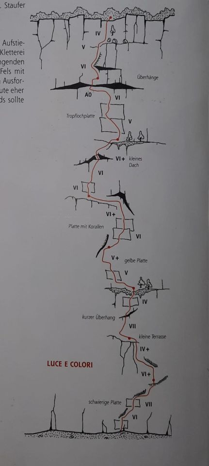 Topo passt recht gut. Die A0 Stelle lässt sich frei klettern (6c+). In SL3 gibt es eine 6b Stelle schon unterm Dach, wo man vom Band hochklettert. Alle schweren Stellen sind max. 3 Züge lang - aber wie Florian Kluckner morgens vor der Tour anmerkte: kurz aber oho...