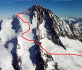 Von der neuen Finsteraarhornhütte 3048m gestartet. Anfangs auf markiertem Pfad auf den Gletscher. Diesen queren zum Pkt. 3616m (Frühstücksplatz), wo man den Grat überqueren muss um auf das nächste Firnfeld zu gelangen. Über diese Südwestflanke, teilweise steil (z.T. Spalten), zum Hugisattel 4088m hoch. Dort beginnt der Nordwestgrat. Über diesen (I./II. Grad), meist aber in der W-Flanke kletternd, auf den Gipfel des Finsteraarhorn 4274m. Abstieg auf der gleichen Route zurück zur Finsteraarhornhütte 3048m.