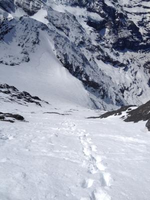Weiter in Richtung Hängegletscher der Westflanke (40°). Kurz unterhalb des Seracs nach links queren (evtl. Fels) und den Hängegletscher über eine Rinne (40°) links umgehen.