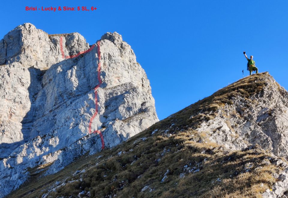 Einstieg: Am großen Loch (nicht zu verfehlen), das wir „Kanonenrohr des Teufels“ getauft haben. Fast schon den Zustieg wert. Gleich schon richtige Kletterei, aber kurz. Man kann auch T5 einfach einem Pfad entlang nach L und an der Wand hoch, um zum zweiten Stand zu kommen (Stand = 1 Bh, bequeme Wiese). SL2 (35 m, 6/6+): sehr schöne Platten mit guten Schuppen, aber auch mal recht abschüssigen Tritten. Immer den Bh nach, im Zweifel R haltend. Stand an Köpfl (1 Bh, man kann Schlinge dazulegen). Grasband: 30 m rüber zur Wand (Stand an 1 Nh plus mittlerer Cam). SL3 (30 m, 6-/6): sieht steil und geschlossen aus, löst sich super. Guter Stand an Kante. SL4 (30 m, 6+): sieht einfach und strukturiert aus, ist aber ganz schön steil. Am ersten Riss: nicht Rampen, sondern etwas R klettern und dann ausspreizen. Zum Dach hoch geht R oder L (L etwas einfacher). Am R Dachrand gerade etwas hoch, dann sieht man auch sofort den nächsten Bh. Davor kann man guten Cam legen, und dann immer den Bh nach (einmal eine coole R-Querung – 2 Moves). Guter Stand oben. Danach auf dem Grasband 30 m waagrecht rüber zur Wand L der Rinne. SL5: (30 m 5+): nicht schwer, aber sehr schön, würdiger und lohnender Ausklang. Stand an 2 Bh and Schrattenkalkblock. Danach fängt dann der „Grünsandstein“ der Garschellaformation an, also jedenfalls klar anderes Kalkgestein auf der kurzen Wanderung bis zum Gipfel. Ganz interessant.