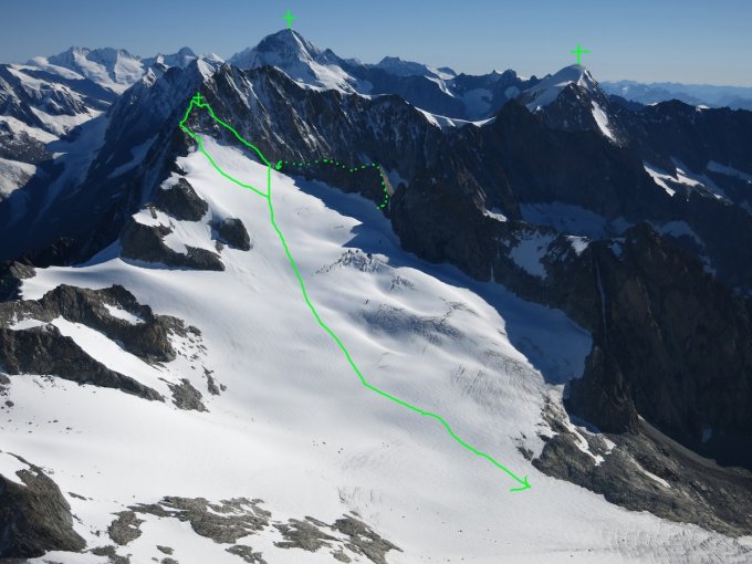 abstieg am besten als überschreitung weiter in westlicher richtung bis man nach links auf den gletscher absteigen kann. dort gibt es einige varianten die je nach verhältnissen besser oder schlechter sind.