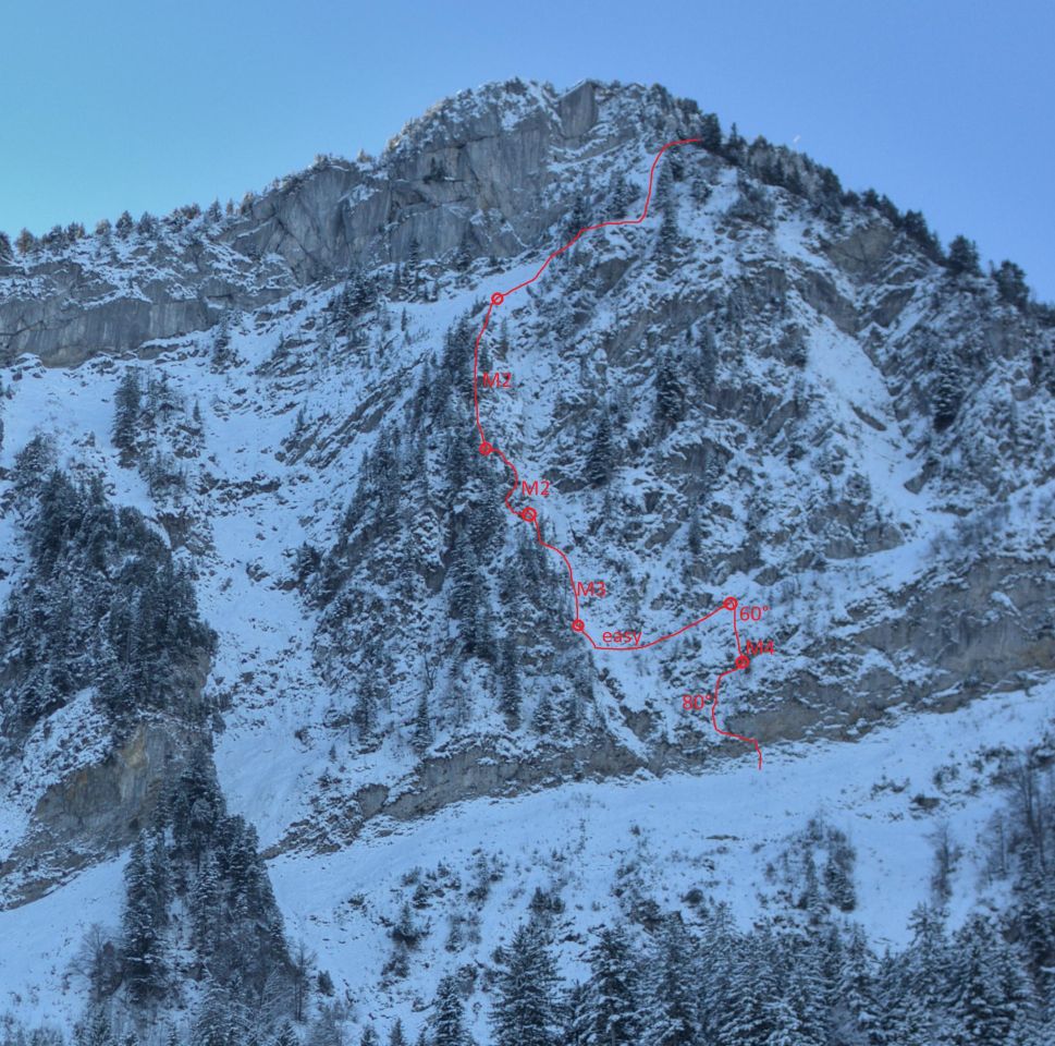 4: 30m on the left side of the couloir, M3. Belay on the left before the couloir get more difficult