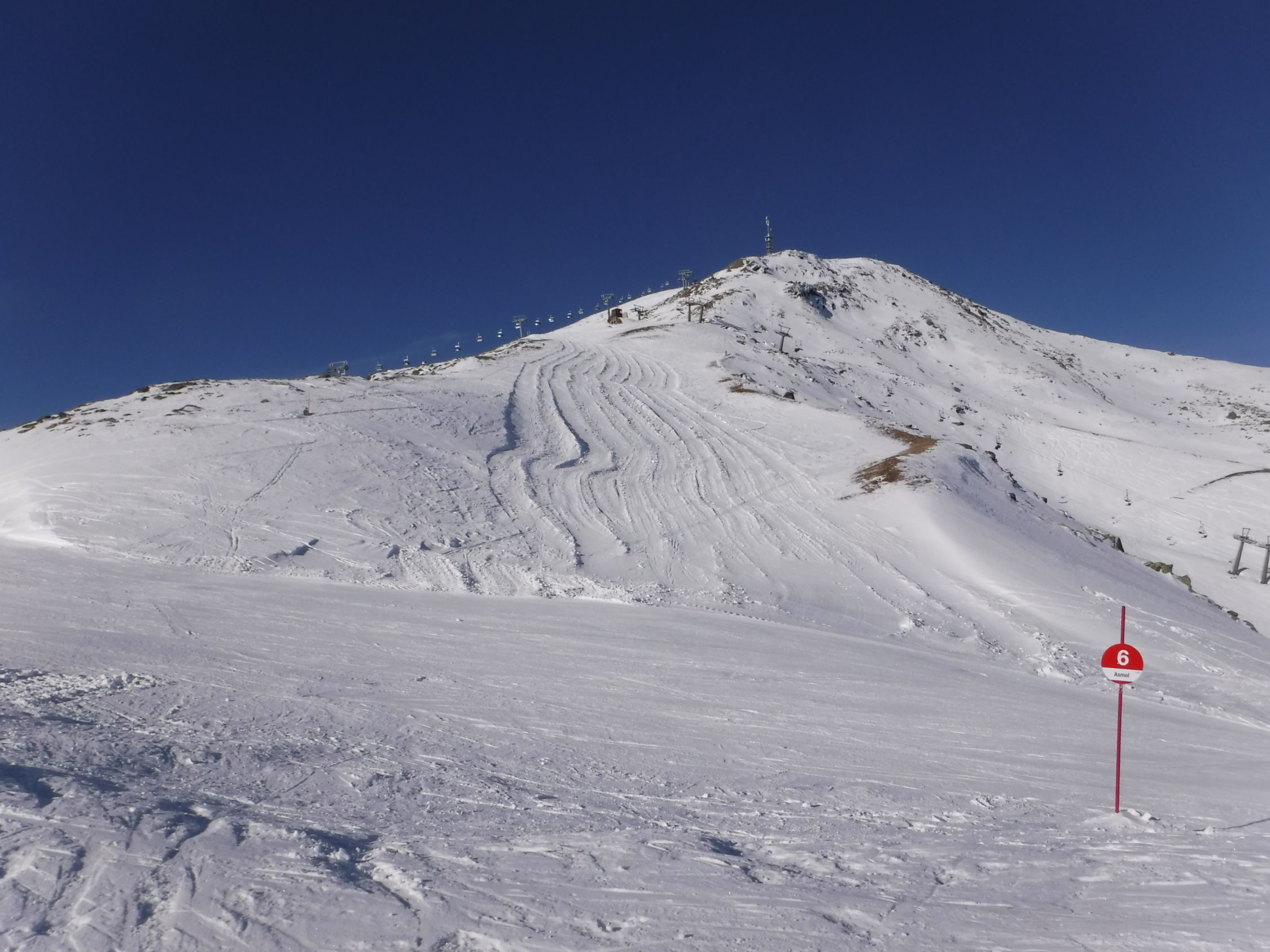 Über den Buckel P 2302 und Drei Mandler (2411 m) kommt man nach 13 min. an der Bergstation des Winterlifts „Asmol“ links vorbei. Nun steigt man etwas rechtsdrehend und rechts von der Bergstation des 4er Hauben-Sessellifts Mutegg zum Holzkreuz auf (35 min.). Dabei hält man sich rechts von schwarzer Piste Nr. 8 („Mutegg“). Das Kreuz wurde im Jahr 2000 und 2014 erneuert. Am Schaft gibt es eine Box für das Gipfelbuch. Vom Kreuz läuft man am Sendemast vorbei bis zur Steinpyramide auf dem höchsten Punkt in 5 min.