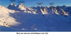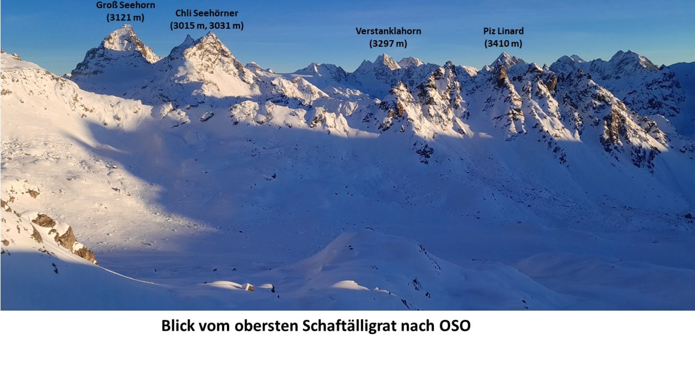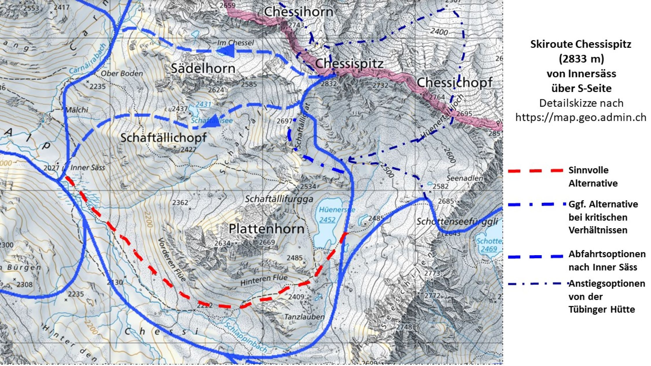 Ob es sinnvoll ist, beim P. 1724 m den Fahrweg Richtung Innersäss zu verlassen, den Schlappinbach (wahrscheinlich ohne Brücke) zu queren, um auf dessen S-Seite zu gelangen und um dann im Talgrund laufend bei Usser Säss wieder den Fahrweg zu erreichen, wie es die in der Landeskarte (map.geo.admin.ch) eingezeichnete Skiroute vorgibt, muss von den Verhältnissen abhängig gemacht werden. Dies ist wahrscheinlich nur bei hoher Schneelage sinnvoll. Ab Inner Säss Richtung SO (Wegzeiger Richtung Hüenersee, Schijenfurgga) nach Chessi und wenig oberhalb vom P. 2130 m dem Sommerweg nach O zum Hüenersee aufsteigend folgen. Alternativ kann ab ca. 2200 m die in der Landeskarte eingezeichnete Skiroute verfolgt werden, die sich mehr im Talgrund hält, Tanzlauben südlich umgeht und anschließend mit einem Schwenk nach N zum Hüenerseee hinaufleitet. Der See wird dann etwas oberhalb auf seiner O-Seite umgangen. Anschließend nach NW schwenken und durch den westlichen Teil der S-Flanke (östlich des P. 2697 m des Schaftälligrates) auf den obersten Teil des Schaftälligrates hinauf. Bei kritischen Verhältnissen kann auch westlich davon direkt über den P. 2697 m des Schaftälligrates aufgestiegen werden. Nach Erreichen des Grates bei ca. 2700 m je nach Verhältnissen weiter mit Ski oder bald Skidepot und zu Fuß über den oberen SW-Grat, einen kurzen steileren Aufschwung übersteigend, zum Gipfelkreuz (Gipfelbuch im Januar 2023 vorhanden).