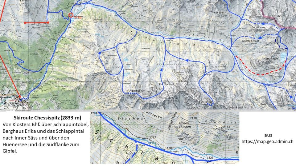Vom Bhf. Klosters Dorf durch den Schlappintobel zum Berghaus Erika. Durchs Schlappintal nach Inner Säss und zum Hüenersee und über den westlichen Teil der S-Flanke auf den obersten Teil des Schaftälligrates