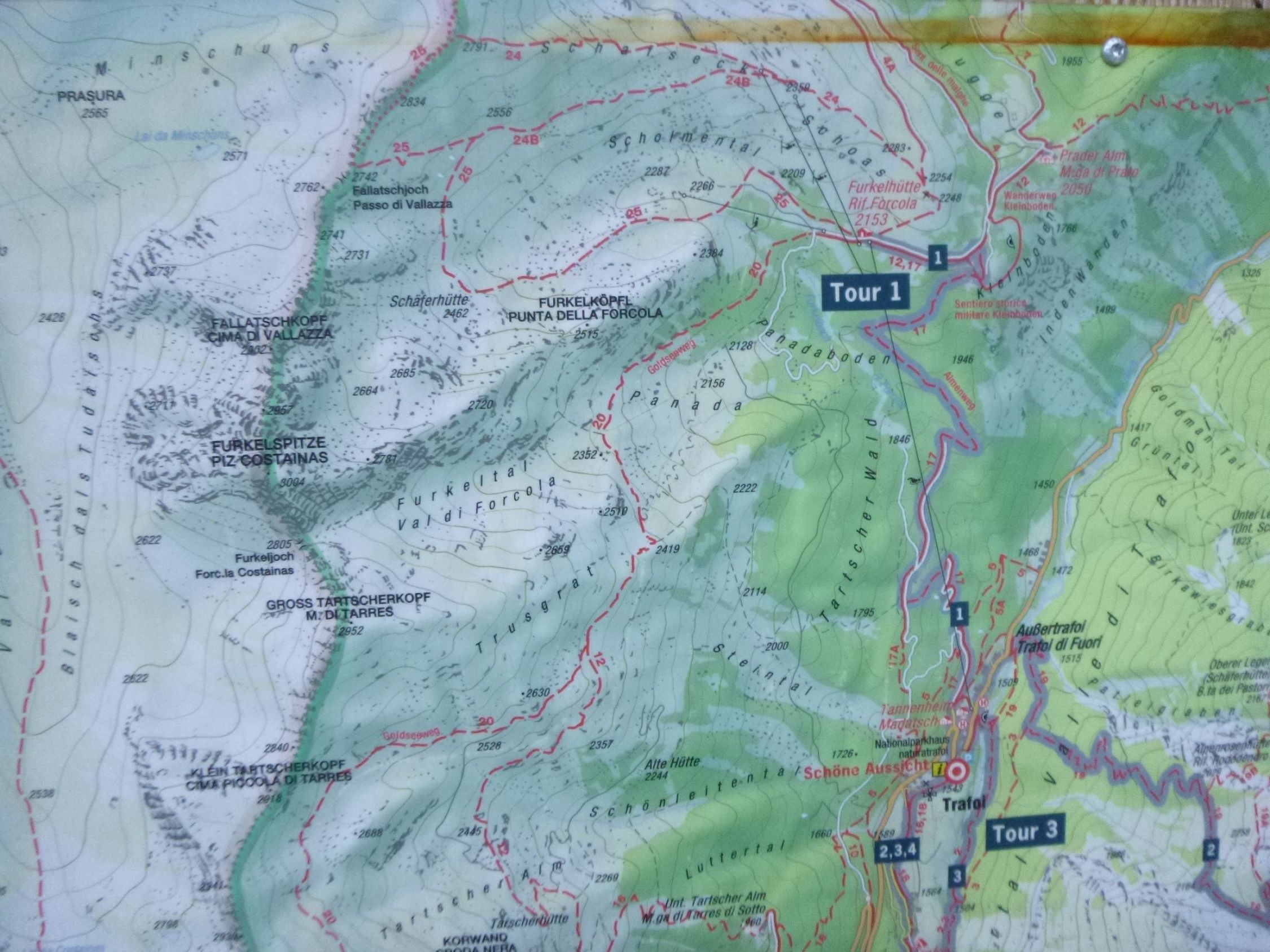 Vom Parkplatz an der Kehre Nr. 46 läuft man die SS 38 ca. 150 m hinauf zur Linkskehre (Nr. 45) Geradeaus am Hotel Madatsch vorbei stößt man unmittelbar danach auf die blau markierte Skipiste Nr. 6 (Sommerweg Nr. 17). Diese kann auch benutzt werden von Skitourengängern, oder SS-Läufern zur Furkelhütte. Auf großer Infotafel des AVS liest man dort die Verhaltensregeln. Zwischen 17:00 und 07:00 Uhr sollte man nicht auf der Piste sein, wenn Pistenraupen evtl. fahren. Man folgt der Piste in nördliche Richtung zu einem Wegweiser (25 min.), wo von rechts der Sommerweg ankommt. Von hier geradeaus weiter in 3 min. bis zur Linkskehre der Piste, wo nächster Wegweiser steht und geradeaus der Sommerweg Nr. 17 zur Hütte weiterführt. Man folgt jedoch der Piste aufwärts bis man auf die Mittelstation (Zustiegsstation) des Doppel-Sessellifts von Trafoi zur Furkelhütte trifft (P 1846, 20 min.). An dieser links vorbei in einer Linkskurve. Danach gabelt sich die Skipiste. Von links mündet die blaue Skipiste Nr. 6 (im Sommer Ziehweg und Güterweg zur Hütte) in die breitere Skipiste. Hier kommt man auf dem Rückweg wieder her. Oder man biegt hier ab, will man auf den Schlenker und einige Hm verzichten. Danach macht die Piste Nr. 4 einen Rechtsbogen und führt an der Talstation (2050 m) zum Belvedere (Schöneben) rechts vorbei (15 min.). Von hier weiter nordostwärts hinauf und in einem Linksbogen zur nun sichtbaren nahen Furkelhütte (Rifugio Forcola, 2153 m, 20 min.). Dort daneben befindet sich die Bergstation des 2er Sessellifts. Beim Wegweiser hält man sich westwärts (links) in Richtung Goldseeweg (Sommerweg Nr. 20). Auf dem Güterweg, bzw. im Winter Skipiste Nr.6 wandert man etwas hinab durch ein Wäldchen bis zu einer Linkskurve am unteren Ende eines breiten, lichten Hanges (P 2128). Hier verlässt man den Ziehweg nach rechts bei einer schwarz gelben Markierung mit der Nr. 21 auf einem Stein. Links vom Sommerweg Nr. 20 beginnt der Aufstieg über den anfangs unsteilen Panadaboden (Plan Panada) in südwestliche Richtung eine 30° steile Geländestufe hinauf zu einem Felsstein (P 2347 (in der Tobacco-Karte: P 2352). Dort kreuzt man den Goldseeweg (Nr. 20), der nach links (Süden) zum Trusgrat führt (40 min.). In westliche Richtung beginnt das Furkeltal (Val di Forcola). Die nächste Geländestufe wird bis zu 33° steil und wird durch eine flache Mulde an rechter Seite hinaufgestiegen unterhalb der Südostflanke der Costa di Forcola. Danach sieht man nun das Furkeljoch (La Forcola, bzw. Fuorcla Costainas). Zu dieser in leichtem Linksbogen hinauf (2804 m, 2 Std.). Nun in südliche Richtung über den steinigen Nord-Rücken aufwärts, wobei man sich meist an linker Seite hält bis zu einer langen viereckigen Stange hin. Nun sieht man rechts etwas oberhalb den nahen kleinen Felskopf. Dort steckt in einem Steinmann ein kleines Holzkreuz (50 min.).