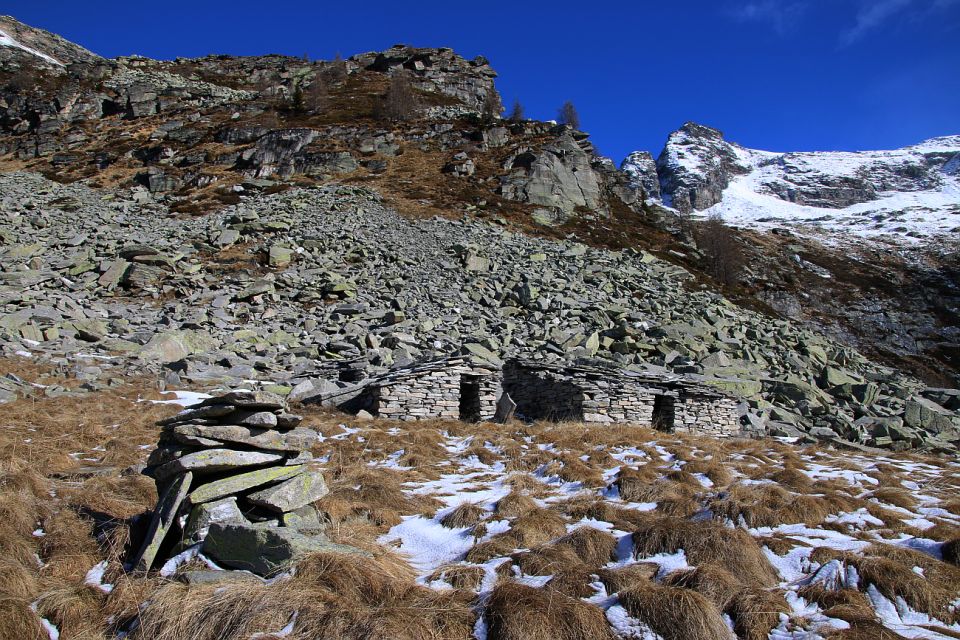 Von hier aus führt ein weiss-blau-weiss markierter Weg hinauf zu den Ruinen von Laghetto auf 2050m. Ab hier ist der Weg oft nicht mehr gut erkennbar und es sind nicht mehr so viel Markierungen vorhanden. Kurz darauf verlassen Sie den markierten Weg und gehen in Richtung Norden, um Ihren eigenen Weg zum Gipfel zu finden.