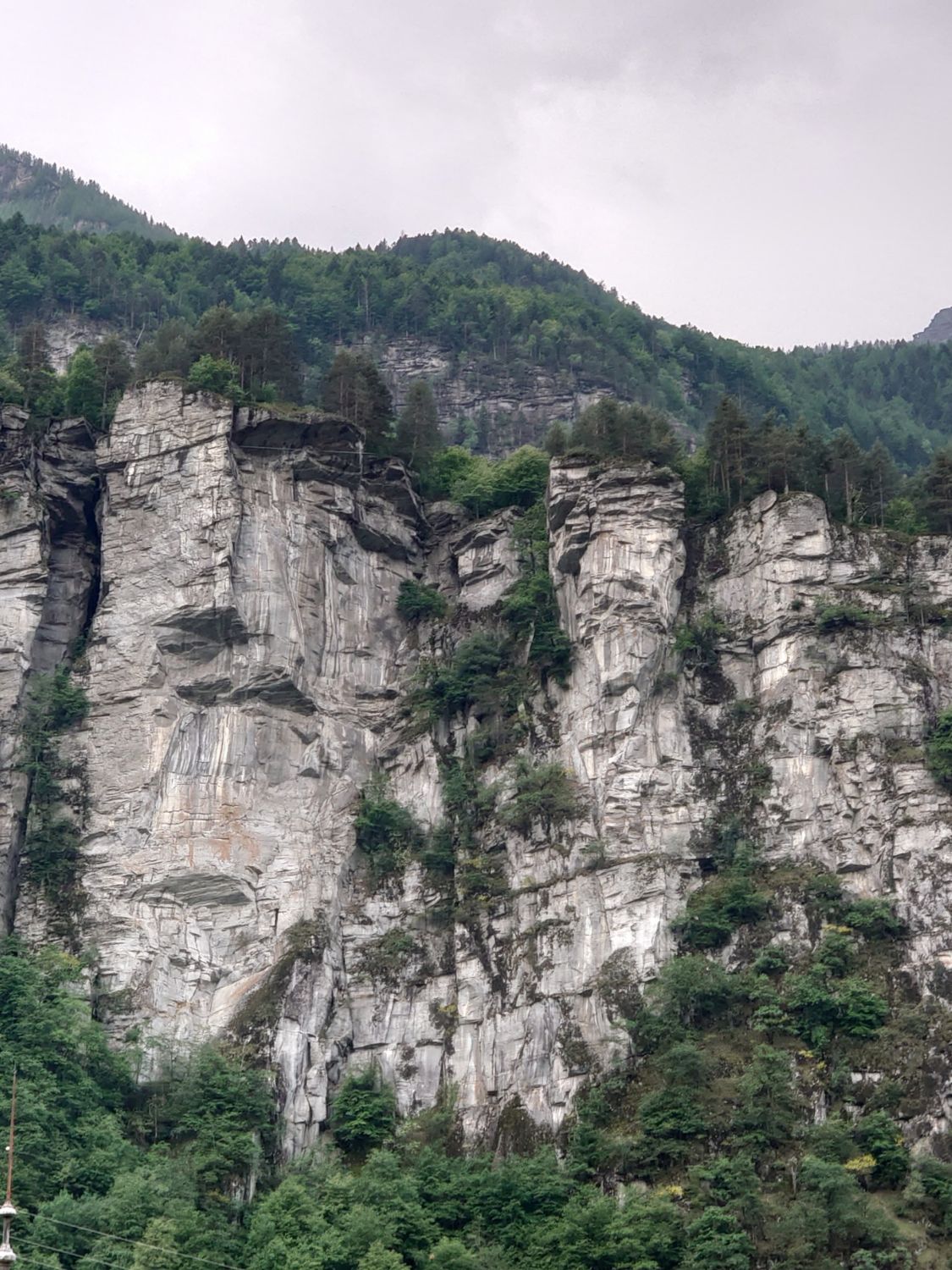 SL7: 6a, blockiges, steiles Wandgelände. Zuletzt über Grasmotten nach rechts aussteigen. Stand am Baum.