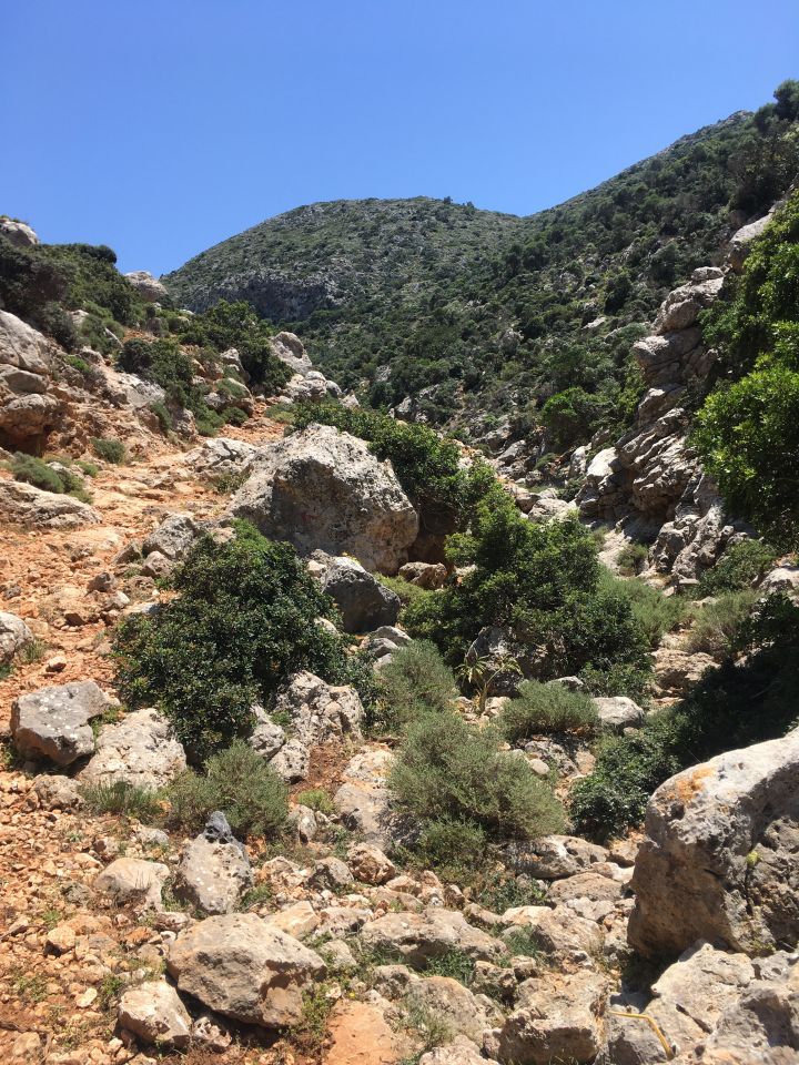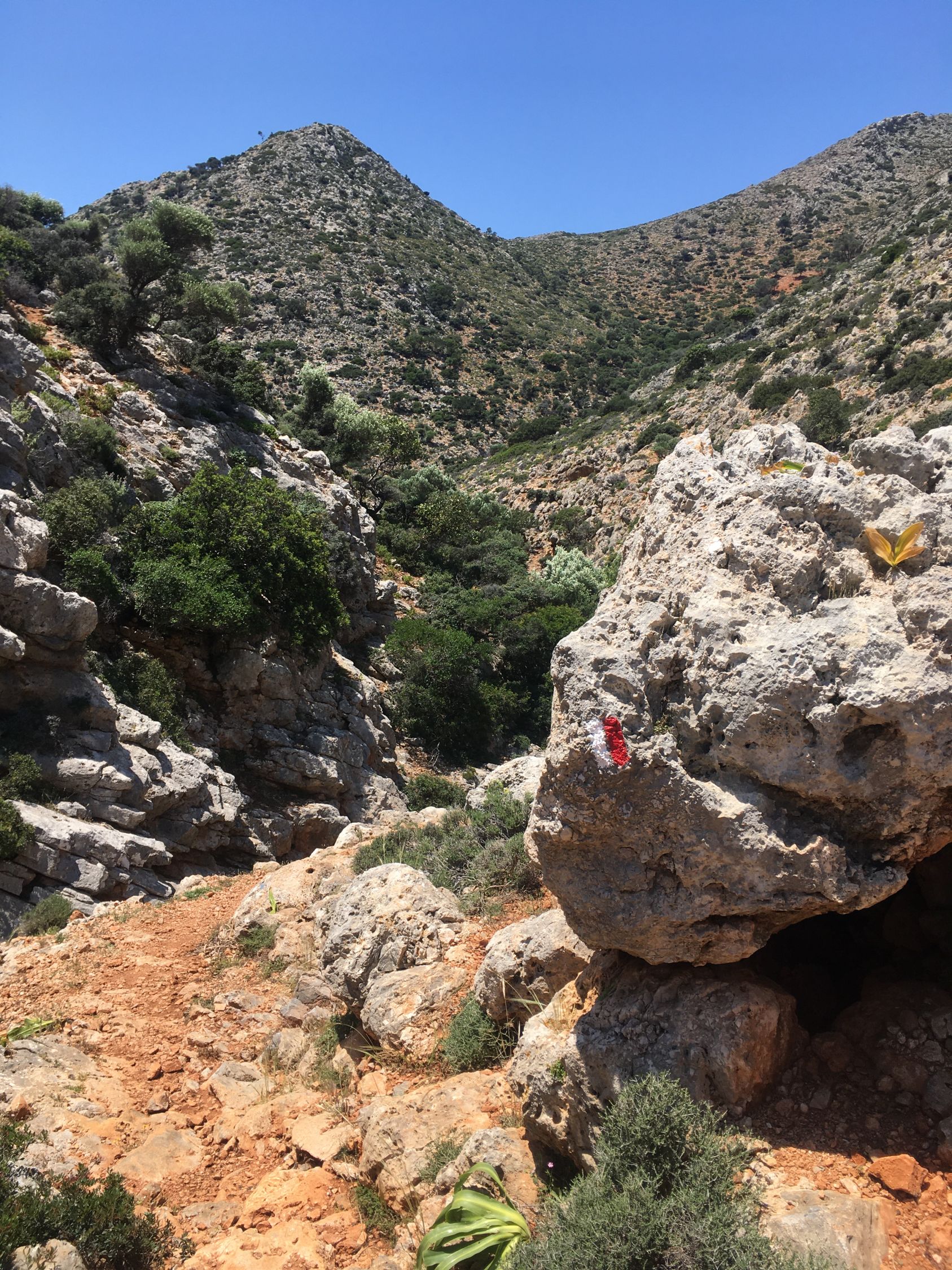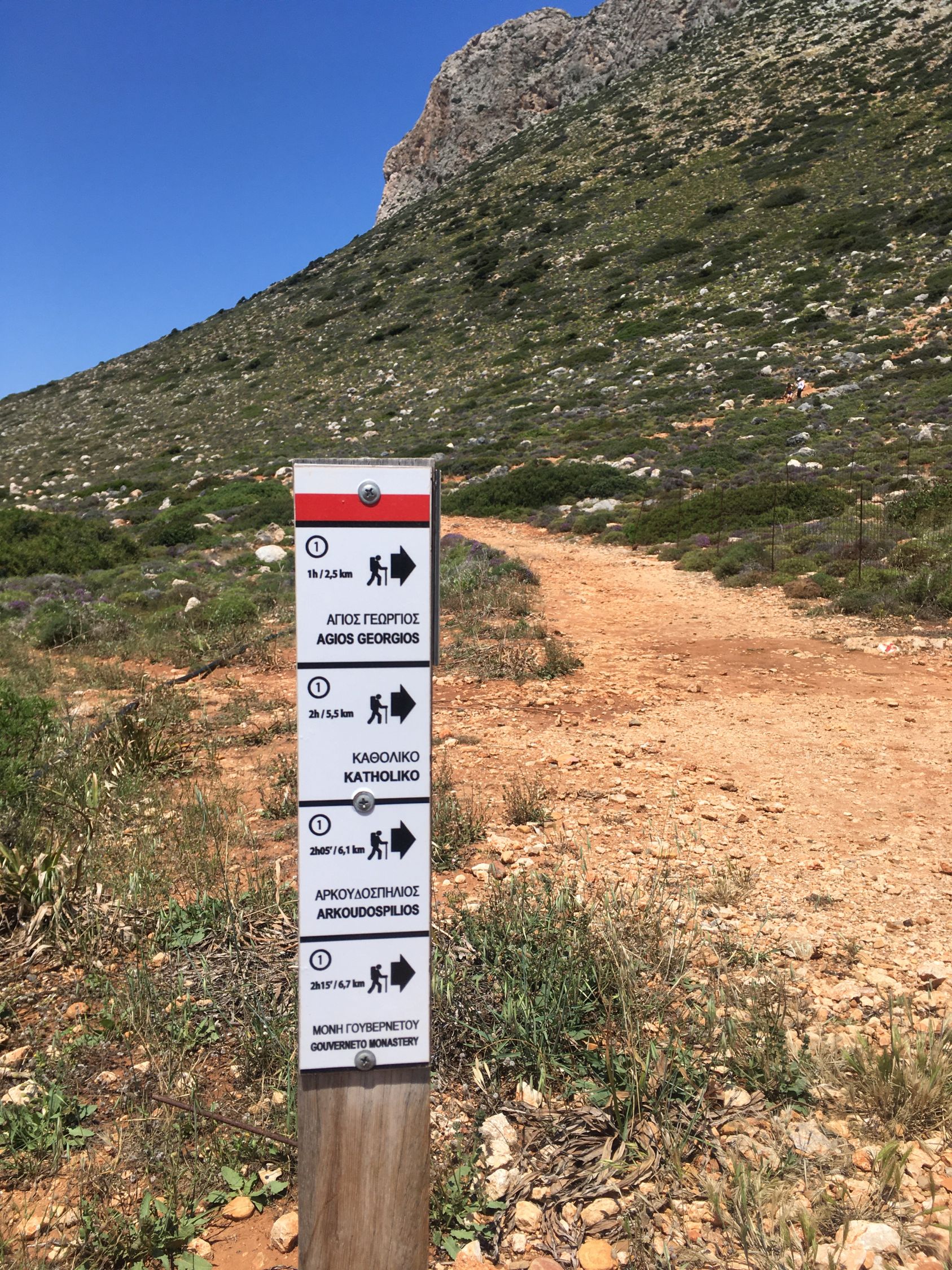 Von Stavros Beach auf markiertem Wanderweg Richtung Nordost Kloster Katholiko, zuerst auf Piste, später in Tälchen auch rotweiss markiert bis Abzweigung links nach Zisterne.