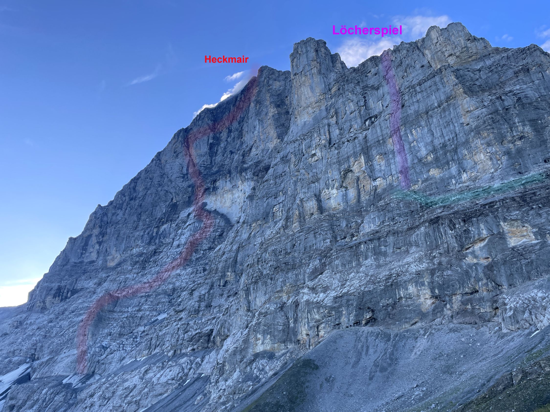 Es handelt sich um die leichteste „moderne“ Route in der Eiger N-Wand. Fels und Ambiente sind wohl ähnlich wie am Genfer Pfeiler, aber die Schwierigkeiten und Länge halten sich doch mehr im Bereich für „Normalsterbliche“. Die Absicherung hat sich 2018 dramatisch verbessert. Danke Daniel Anker und Gefährten für diese Linie und die Sanierung (und auch das sehr gute Topo). Es ist immer noch keine „Plaisirsicherung“ aber durchaus ähnlich wie viele andere top-bekannte Routen in dem Grad im Rhätikon oder in den Churfirsten. Die Kletterei/Linie ist durchweg sehr schön, interessant und eindrucksvoll.