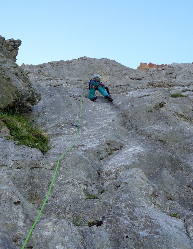 SL10 (35 m 5+). Gerade nach oben. Stand dann leicht L in einer kl Nische. Diese SL ist etwas brüchig. Sie ist nicht schrofig (eher geschichteter Fels) und etwas verschneidungsartig (man drückt und schiebt, muss wenig ziehen). Lässt sich also sicher klettern.