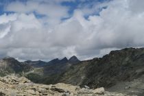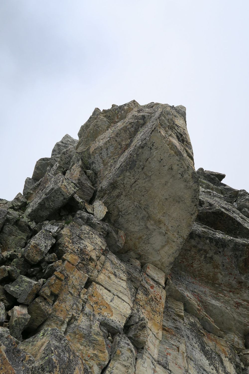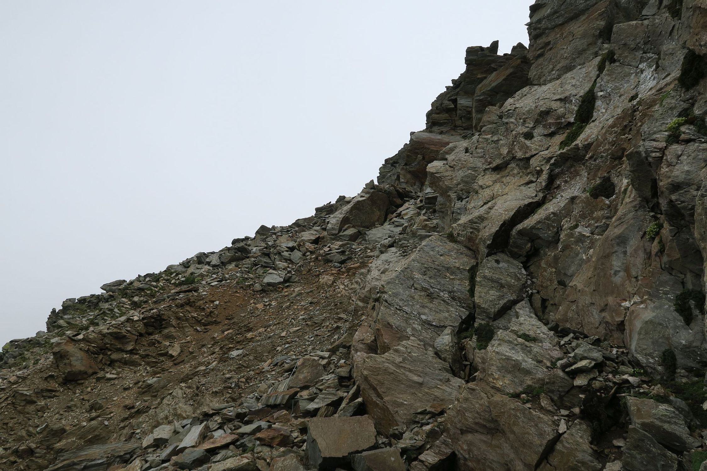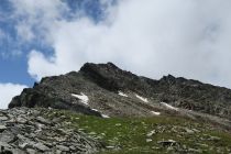 Traverse in die Südflanke mit vorhandener Rebschnur im ungemütlichen Übergang, wieder über Geröll bis zum Südwestgrat, etwas rechts vom Südwestgrat die abschüssigen Felsen hochklettern auf den Gipfelgrat. Über den blockigen Gipfelgrat mit viel auf- und ab die ca. 100 m Distanz zum Hauptgipfel überwinden. Den Hauptgipfel von Westen besteigen.