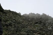 Über viel Geröllblöcke T4 1 ½ Std. bis zum Gratturm der überklettert werden müsste. Dahinter ein zweiter Turm mit Fixseil, da die Felsen vereist waren, Abbruch der Südostgratroute.