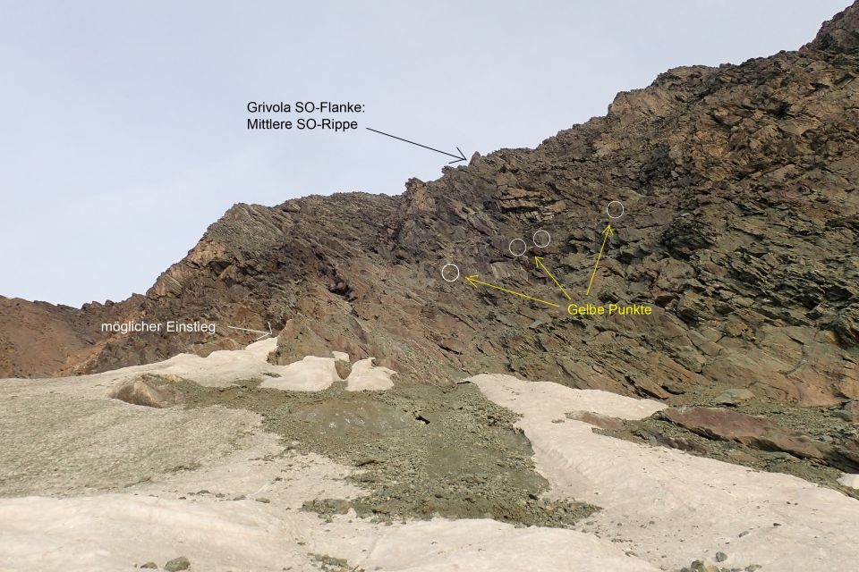 Route: Vom Gletscher möglichst über Firn hoch unter die Mittelrippe. Dort werden die gelben Markierungen sichtbar. Die Rippe selbst wird über einen Rechtsbogen erreicht (wenige Stellen III, Bohrhaken, Abseilstände). Sie weist recht passablen Fels auf, während auf den Bändern und Absätzen halt viel Schutt und Geröll liegt. Auf ca. 3800m verlässt man die Rippe definitv nach rechts (steinschlaggefährtdete Querung, bei mehrereren Seilschaften Vorsicht!) und zieht gegen den NO-Grat hoch. Ein steiles Wändchen am NO-Grat wird links über Felsstufen (Trittspuren) umgangen.