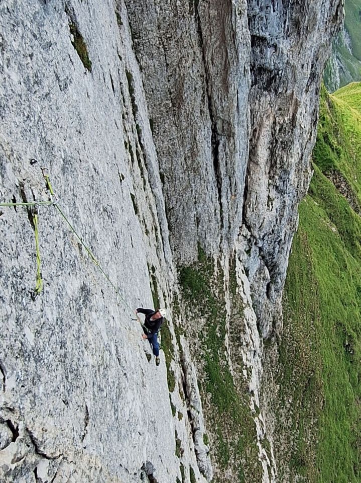 Start von der Filderalp, 1625 m (alternativ kann man vom Äscher her zum Altenalpsattel (1809 m) und von dort auf den N-Weg von der Filderalp absteigen). Von dort ca. 1 h, wenn man nicht trödelt. Die Führerangaben sind etwas zu knapp für normal Geher. Wie beschrieben unter den Läden entlang (guter Weg, wenn trocken). Dann weiter durchs Gras (immer wieder Wegspuren), der guten Beschreibung von Küng folgen (T3-T4). Nicht zu früh hoch, eher unter den großen Wasserstreifen etwas weiter nach W, und dann schräg nach SO hoch (letztes Stück T4). Unterm Vorbau ist ein breiter bequemer Weg, auf dem man den Gurt anlegen kann. Dann am L Ende des Wegs die Felsen hoch (I, 2 Bh) und auf dem band nach W (T5, 5 Bh). Alles gut ohne Seil machbar. Definitiv nicht mehr als T5 für ein kurzes Stück. Stand an 2 Bh, ca. 10 m L der Verschneidung.