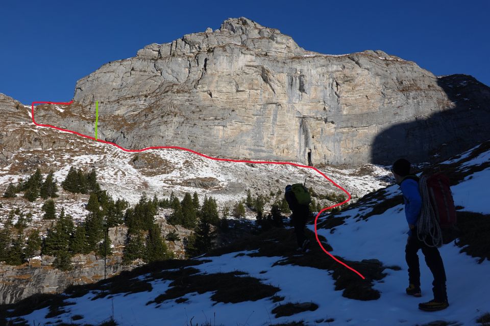 Zuerst steigt man auf dem Weg an den Wandfuss der Burg hinauf. Danach der Wand entlang nach Westen, um eine Ecke hinauf zu einer Grotte. (Seilt man später vom Burggrat hinab, landet man hier. Depot Wanderstöcke) Anschliessend über Grasband (expo!) und an Fixseil hinauf auf den Grat und weiter zum Wandfuss.