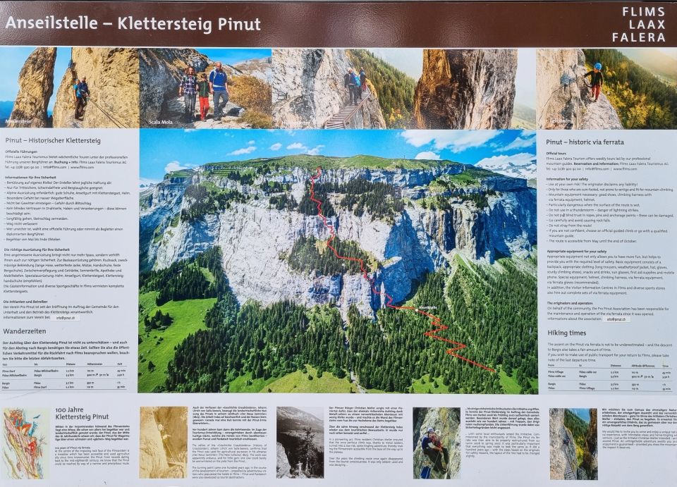 Abstieg via Tegia Gronda, Scala Mola, Bargis zurück nach Fidaz. www.pinut.ch. Keine echten Kletterstellen. Vorwiegend Aufstieg via Treppen. Für geübte Alpinisten auch ohne Sicherung machbar. Die offizielle Angabe ist 30 Minuten für den Zustieg ab Fidaz und 2h20m für den Klettersteig. Ich habe beides in 1h20m gemacht. Der Abstieg zieht sich dann aber. Die 700m Höhenmeter beziehen sich nur auf den Klettersteig.