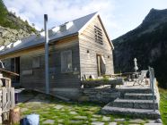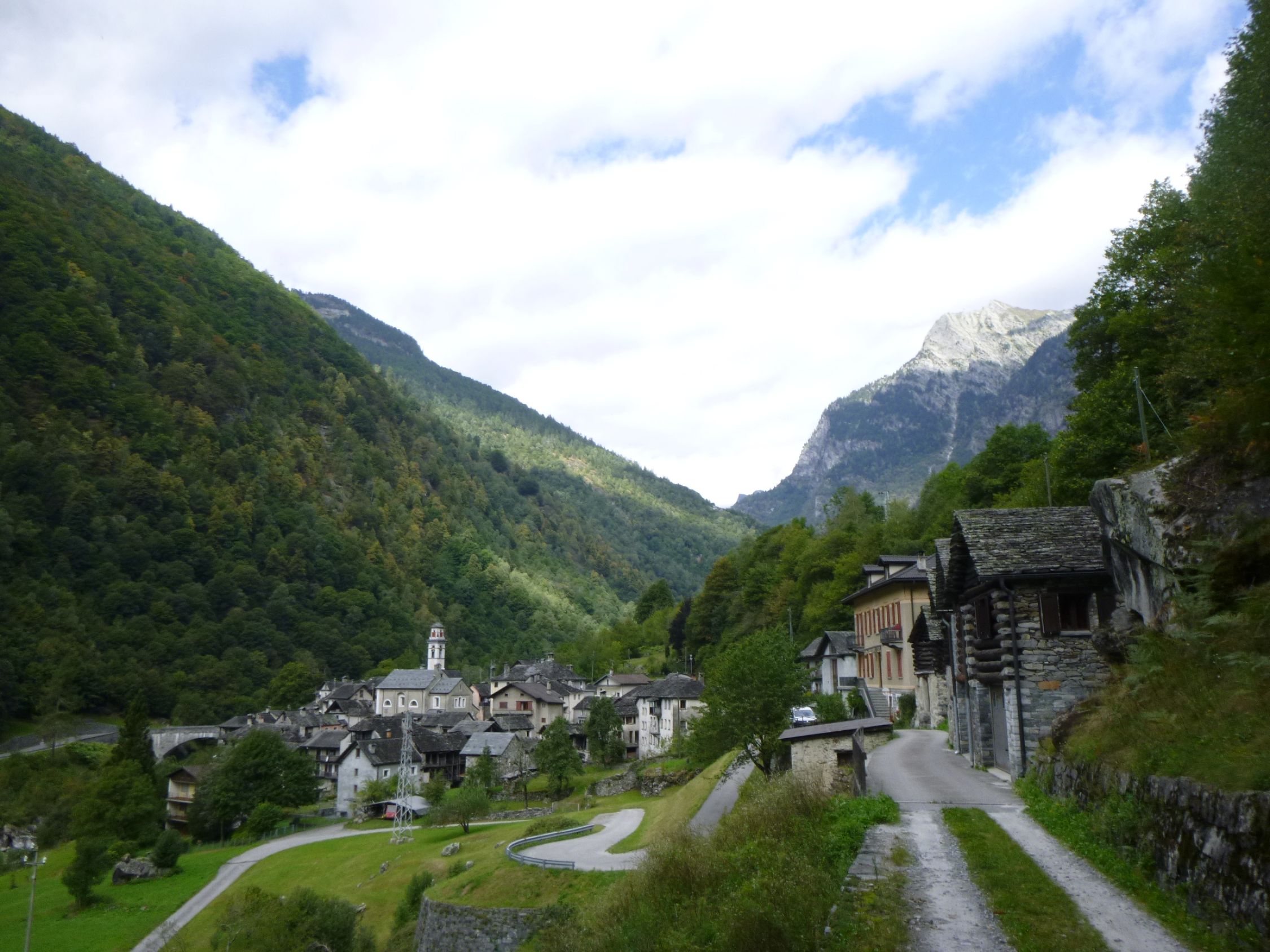 Die Tomeo-Hütte vom Patriziato di Broglio (1740 m) wurde im Jahr 2014 gebaut.. Links vor der Hütte gibt es einen Brunnen und die kleine alte Alphütte, welche 2010 restauriert wurde und nun als Winterraum fungiert mit 7 Matratzen im flachen Dachgeschoss und einem Holzofen im Erdgeschoss nebst Mini-Küchenecke mit Gaskocher. Die neue Hütte bietet im Erdgeschoss im vorderen Teil einen Aufenthaltsraum mit 24 Plätzen und eine Küche, im hinteren zwei WCs mit zwei Duschen, einen Schuhraum und einen Keller. Das Obergeschoss ist mit zwei Schlafzimmern mit je sechs Betten, einem Zimmer mit acht Betten und einem Zimmer für den Hüttenwart ausgestattet. Auf der Südseite befindet sich eine große Panoramaterrasse. Die Hütte stellt einen der Etappenorte der Via Alta Vallemaggia dar. Man wandert vom Wegweiser beim Alpgebäude von Corte Grande (1739 m) in nördliche Richtung über einen Wiesenhang zu einer schrägen, grasdurchsetzten Felsenplatte, die meist nass ist. Über verbogene Stahlstifte an einer schmalen Leiste überquert man diese. Dabei kann man sich an rechter Seite an dort hängender Kette festhalten. Danach gelangt man in den Wald. Dort dreht der Weg nach links und führt steil hinab in die Schlucht des Ri di Tomé. Rechts oberhalb vom Bach folgt man dem rot-weiß signalisierten Bergweg nordwärts. Bei einem Wasserfall steht eine kleine weiße Madonnenfigur in einem kleinen Schrein aus Felssteinen. Auf Höhe von ca. 1410 m überquert man einen Bach, der von rechts herunterfließt. Stellenweise ist der Bergweg gut und mit breiten Steintreppen ausgebaut, an anderen Stellen aber auch etwas ruppig. Das Val Tomé dreht talwärts in nordwestliche Richtung. Auf einer Lichtung kommt man an den Ruinenresten ehemaliger Alpe Valle (1090 m) vorbei. Über 2 Wasserläufe führt der Weg durch den Wald von Rozzola hinab zur Brücke über den Ri di Tomé (757 m). Vor dieser trifft man auf den Wanderweg (Sentiero Lavizzara) zwischen Broglio und Sornico-Prato (Wegweiser), in den man rechts einschlägt. Nordwärts erreicht man eine Wegegabelung (P 734), wo man geradeaus bleibt. Danach erreicht man eine Lichtung bei Vedlà (740 m). Dort steht das Oratorium zum Heiligen Kreuz (Oratorio del Danto Crocifisso) seit 1758. Daneben gibt es einen Brunnen bei einem weiteren Haus. Weiter in nördliche Richtung durch den Wald erreicht man die Steinbogen-Brücke über den Riale Valle di Prato (740 m). Am nördlichen Ende der Brücke steht ein Bildstock und biegt nach links ein Weg ab (brauner Wegweiser), den man ignoriert. Danach führt der breiter gewordene Weg an den beiden Häusern von Mòta da la Crèda links vorbei. Vorbei am Haus Ciòss gelangt man nordwestwärts zum Ziegenhof und zur Sennerei von Sóstan Wegweiser, 768 m). Hier mündet der Weg in unbefestigte Fahrstraße nach Monti die Predee (Pradé). Man schlägt links ein und gelangt auf der Via Alpina in den Ort Prato. Auf einer mit Kopfsteinen gepflasterten Straße mit Beton-Fahrstreifen wandert man durch die schmale Gasse des idyllisch aussehenden Bergdorfes an der Kirche mit einem Wasserbrunnen vorbei bis man auf die Hauptstraße kommt. Links vom Nordportal der Steinbogenbrücke über den Fluß Maggia befindet sich gegenüber vom Ristorante „al Ponte“ ein geschotterter Parkplatz an linker Straßenseite (2¼ Std.).