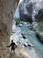 Leave the tunnel at the Baumé aus pigeons and descent with ropes to the beach/river. Walk up (against stream direction) until you are really close to the water. You can see 2 silver bolts (not the golden ones) indicating the first pitch of the route. If the water level is really low you could maybe walk to a fixed rope and skip the 4b pitch. Otherwise start next to the water following the 2 bolts (more will come)