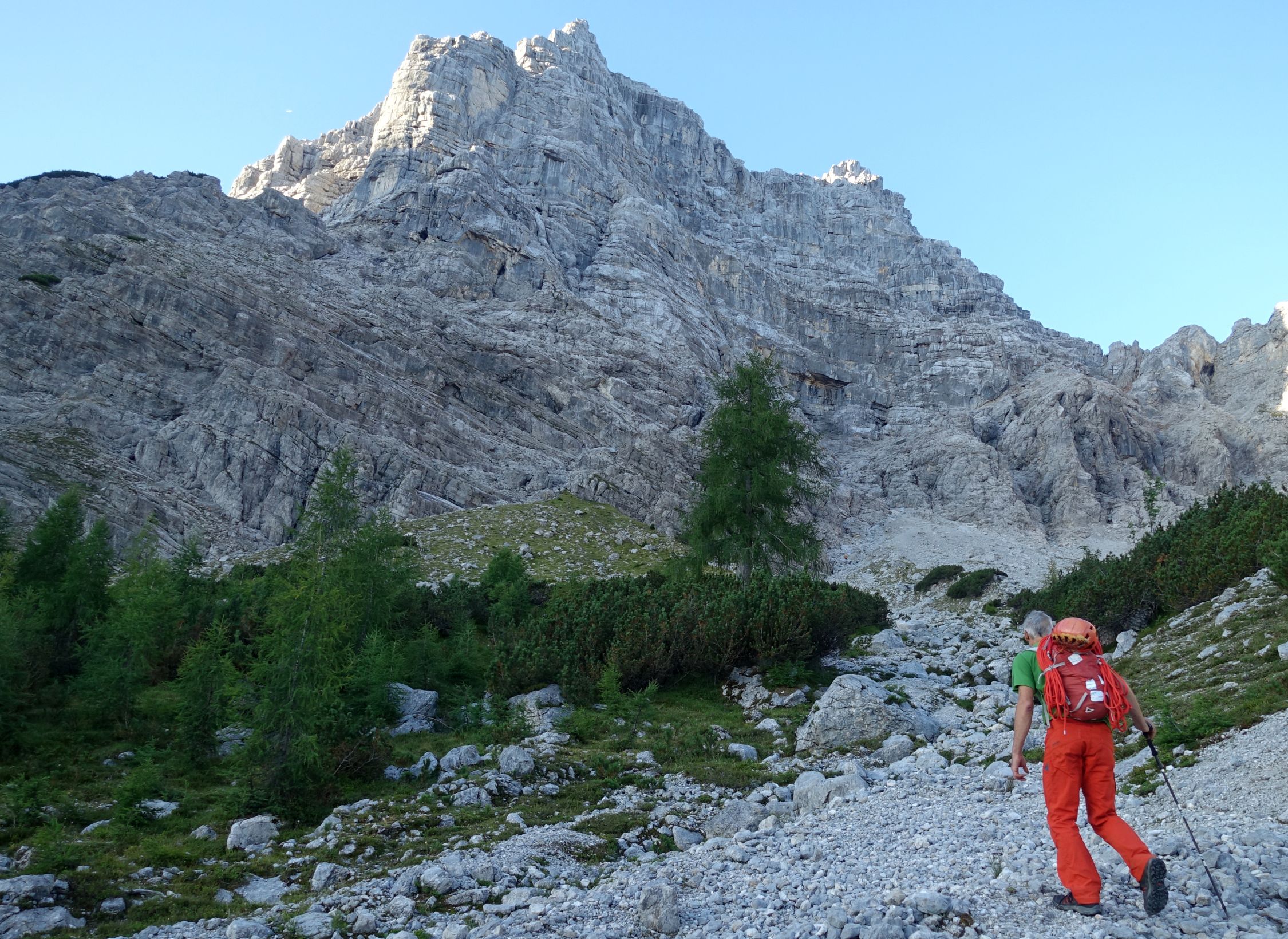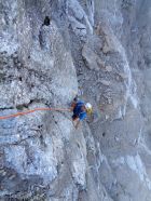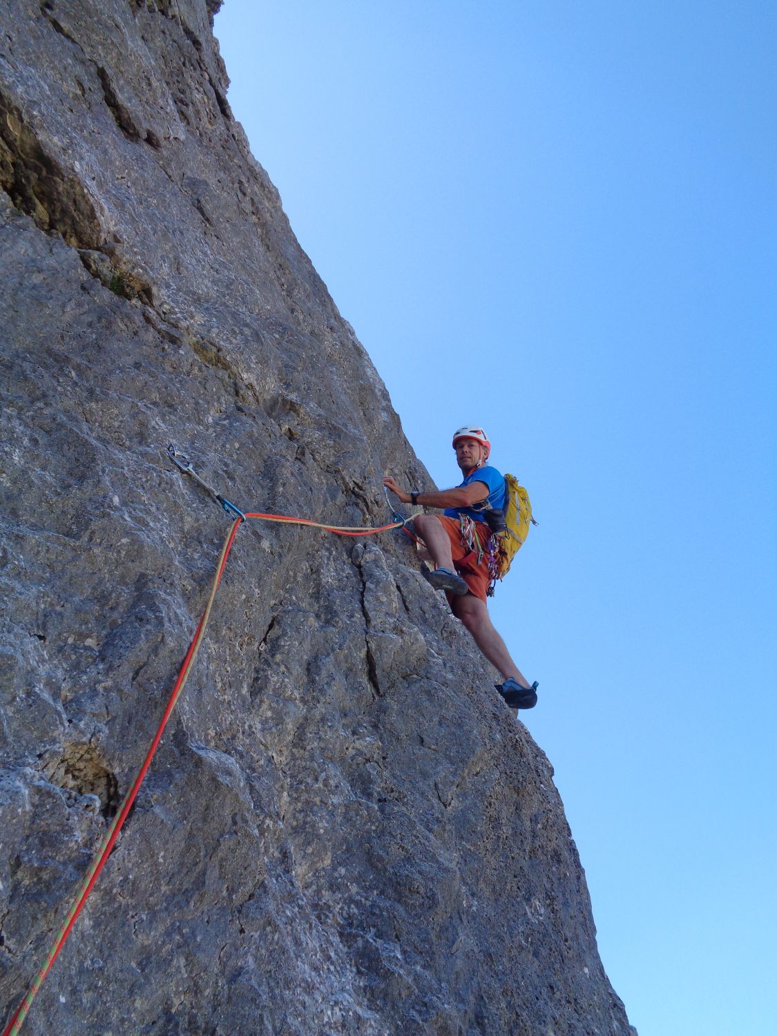 SL1: es geht gleich richtig los... SL3: nach R in die Rinne, gar nicht so einfach. Muss zwingend geklettert werden. SL 5: Fortsetzung gut zu finden (ziemlich weit R). SL6 (Halluxplatte): Gute Steilplatten mit Schuppen, um an die Crux ranzukommen. Dann kurzer Plattenboulder an zwei Leistchen (oder 1 Bh A0). SL8: 1 kurzer Wulst oder 1 Bh A0. SL9 (Ischiaswandl). Gute Steilplatten mit Schuppen). SL14: nach 40 m sieht es aus, wie wenn man etwas brüchig waagrecht nach R müßte. Tatsächlich geht es eher nach oben (Bh im kleinen Aufschwung und zum Stand direkt neben Rippenkammerl (das sieht man aber erst vom Stand). SL16: sehr gute Rissverschneidung – steil. SL17: Zwischenstand nicht nötig. Den Körperriss kann man komplett aussen spreizen. Auf den letzten 2-3 m mögen manche vielleicht lieber in den Riß. Geht mit Rucksack, ist aber sehr rustikal. SL18: tolle Länge, außer direkt unterm Dach sehr guter Fels und sehr griffig. Aber steil und schwer den großen Henkel überm Dach zu sehen. Die meisten werden 2-3 Bh ziehen. Auch das macht Spaß (und braucht etwas Power) da wirklich steil. SL21: nochmal echt steile Verschneidungskletterei. SL22: wir haben die einfach nicht gefunden. Man muss jedenfalls sehr weit nach R (50 m). Das kann man direkt 3 m überm Stand machen, oder auf dem nächsten Band oder dem übernächsten. Wir haben das übernächste genommen und da wo man dann wieder auf die Route trifft ist ein Bh und ein Steinmann auf dem Band. Von der Stelle sind es noch 10 m zum Stand von SL23. SL23: hier wieder alles klar... ein steiler Riß durch die Wand. Da wo es aussieht wie wenn man nach R rausqueren sollte, NICHT queren, sondern 2 m höher im Riss und dann relativ einfach R raus und der Rißlinie und en Bh folgen. Das ist gar nicht trivial. Immer wieder Steilaufschwünge mit kleinen Schuttbändern darunter. Man muss gut auf den Seilverlauf achten, damit das Seil beim einziehen keine Steine runterwirft. Stand kommt etwas überraschend nach dem letzten Steilaufschwung am senkrechten Eck direkt darüber. Das ist recht unbequem, verhindert aber, daß man auf dem Geröllband steht und für das Seil so, daß es sauber durch die Luft läuft. Danach, einfach direkt auf den Gipfel.