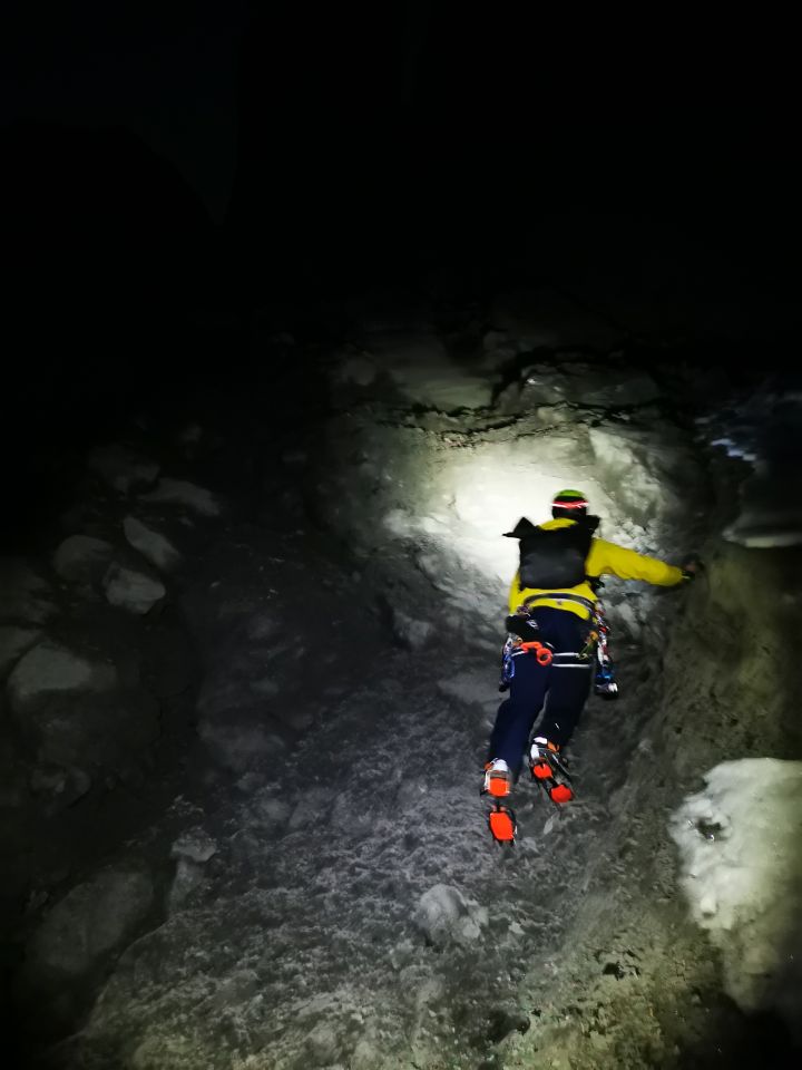 Die Rampe ist in den letzten Jahres immer mehr zusammen gebrochen. Nun der Einstieg sehr steil mit kurzen heikeln sehr brüchigen Passagen. Mittelteil so wie früher ok. Zum schluss nochmal sehr brüchig und ich weiß nicht wie lange das da noch liegen bleibt… Den alten Einstieg gibt es nicht mehr er ist weg gebrochen es fehlen ca. 20 m von der rampe die jetzt ins nix führt. Habe mit 2 Nägel einen neuen stand gemacht und die am besten aussehende stelle probiert zu klettern war mir aber nicht sicher wie es weiter oben ist. Die Seillänge ist teils sehr brüchig mit kurzen Überhängenden Passagen so wulst artig. Wenn der Griff hält ist er meist gut aber man muss sehr kontrollieren was man in die hand nimmt! Zum absichern schwer erst nach der hälfte kommt ein alter nagel etwas links und man kriegt einen roten frind rein da kommt man wieder zum Teil auf die alte route… stand bei einen geklebten Bohrhaken ca 25m V-V+. Danach ist man wieder auf der orginal Route 1 seillänge IV+ mit 2 Bohrhaken stand etwas links an 2 Bohrhaken mit kette erst spät zu sehen durch Ausbruch. Danach kurz über sehr brüchiges leichtes Gelände links gehen (katzenauge) danach stand an felsblock mit Bohrhaken. Nun einfache Kletterei. Wir blieben meist am grat weil nordseitig viel Schnee lag. Bis unter den Mitcherkopf passte das dort seilten wir uns kurz wieder an wegen ein paar längs Spalten. Und nahmen dort die Schwachstelle und gingen in recht grader line auf den Mitcherkopf zu leider kein firn eher pulver bis zum knie und da drunter die Felsen(ca60 grad). Bei Firnverhältnissen einfacher und schneller!