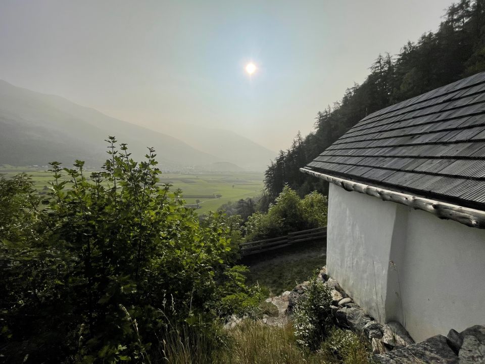 Vom Startpunkt im malerischen Glurns (912 Meter) im Obervinschgau geht es gleich am öffentlichen Parkplatz beim Stadttor links auf einem schönen Weg durch Apfelplantagen in Richtung Laatsch und weiter nach Schleis.