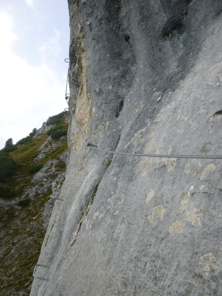 Der Klettersteig wurde benannt nach der Ehefrau nach der Ehefrau von Julius Steiner, der das Steinerhaus erbauen ließ und mit verantwortlich war für die touristische Erschließung des Stoderzinkens. Eröffnet wurde er am 22.6.2022. Das 700 m lange Seil mit 14 mm Durchmesser führt über 370 Hm durch die südlich ausgerichtete Kalksteinwand. Der Einstieg beginnt unschwierig über eine gerundete Rampe nach rechts hinauf. Danach läuft man über erdiges Gelände entlang des Felswandfußes nach rechts zum nächsten Felsen, den man weiter nach rechts auf Reibung traversiert. Danach wird ein kurzes Schotterfeld überlaufen zu einer Wandstufe. Über diese helfen Eisenbügel hinauf. Ein Pfeiler wird an einer Kante umgangen mit Hilfe von Eisenbügel. Danach kommt die schwierigste Stelle bei einer rotbraunen schrägen Platte. Eisenbügel und Seil folgt man bis zur Felskante hinauf. Nach nächster kurzen Schotterzone klettert man durch eine Felsenrinne hoch zu einem Absatz. Kurz nach links erreicht man wieder eine kleine Schotterzone. Über die Höhlenwand nähert man sich fast der östlichsten Übungssteig-Route vom Klettersteiggarten. Unschwierig klettert man auf Eisenbügeln über senkrechten Felsenpfeiler zu einem grasigen Schräghang. Nach diesem kommt noch einmal ein Felspfeiler, jedoch kürzer. Das Stahlseil führt nun über beginnendes Felsplateau zur Stange mit dem Windkorb für die Gleitschirm- und Drachenflieger am Süd-Startplatz am Wanderweg Nr. 675 (2 Std.).
