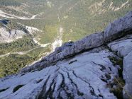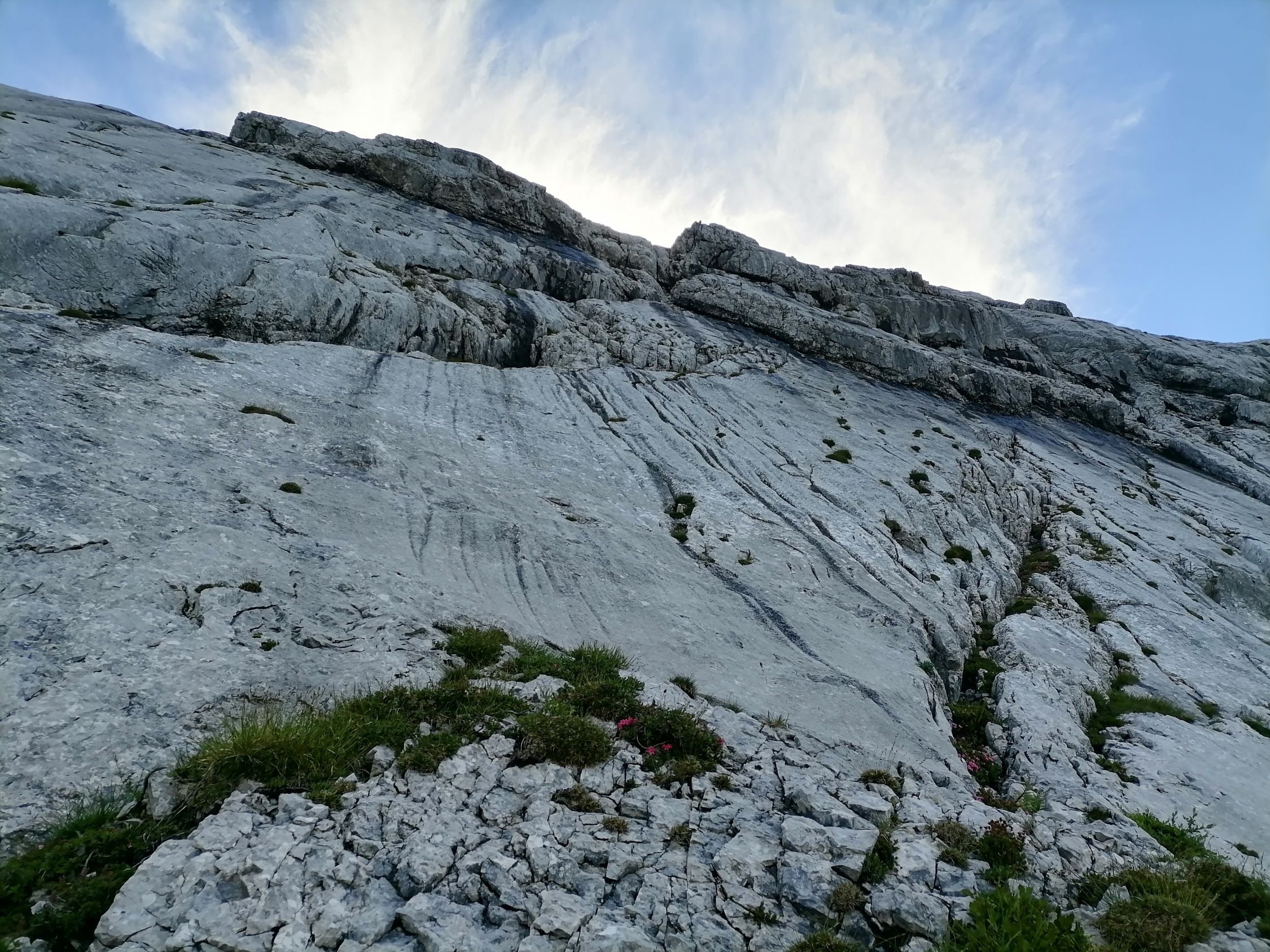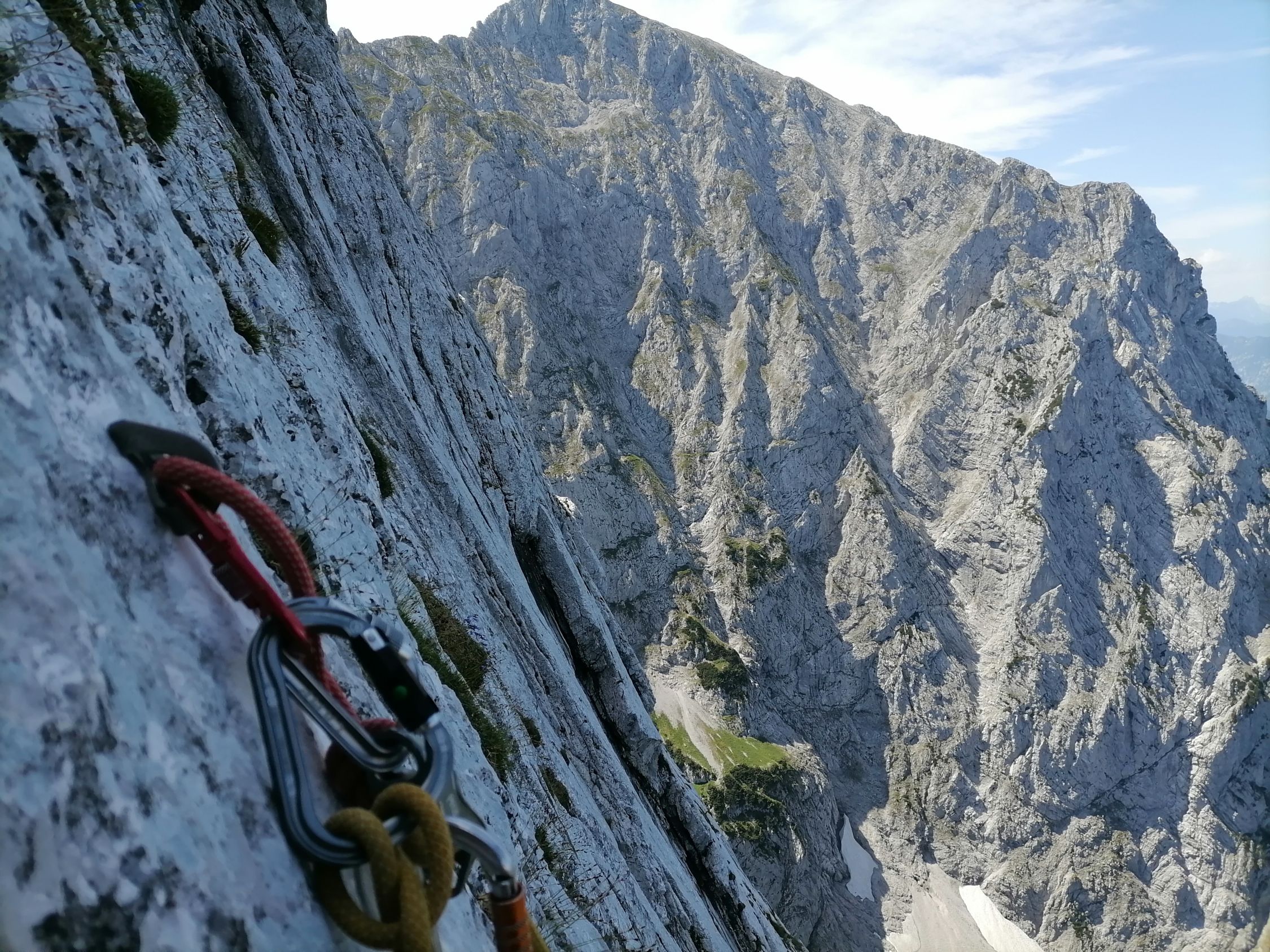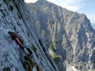 Mittlerweile (Sanierung 2022 mit Edelstahl BH) tlw. mit BH an den Standplätzen und einigen wenigen gebohrten Zwischenhaken abgesicherte alpine Kletterei an kompakten überaus schönen Platten, nur einige wenige Stellen sind grasig. Die Tour ist Aufgrund von Länge und der tlw. etwas luftigen Absicherung trotz der niederen Schwierigkeiten nicht zu unterschätzen. Der Weiterweg auf den Gipfel der Kleinen Halt dann über die klassische Enzensperger Führe III, an den Standplätzen je 1 BH auf den Gipfel der Kleinen Halt.