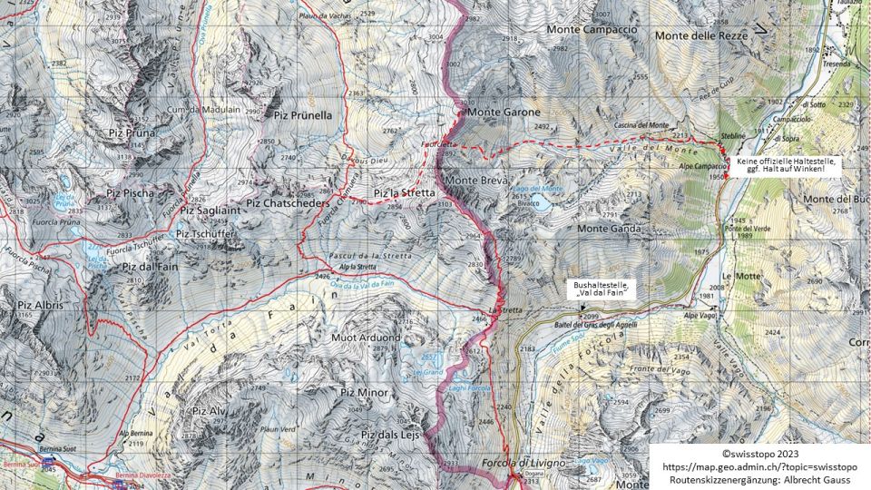 Bei der Alpe Campaccio ist an der Autostraße von Livigno zur Forcola da Livigno keine offizielle Bushaltestelle. Der Busfahrer hält aber ggf. auf Winken an (wie am 25.09.2023). Ansonsten ggf. Autostop. Die nächste offizielle Bushaltestelle in Richtung Forcola di Livigno ist 3,5 km entfernt: Haltestelle Livigno, Val dal Fain (bei der Baitel del Gras degli Agnelli). Dorthin gelangt man, indem man an der Straße entlang bis zum P. 1975 m und anschließend auf einem parallel östlich bzw. südlich der Straße verlaufenden Weg läuft.