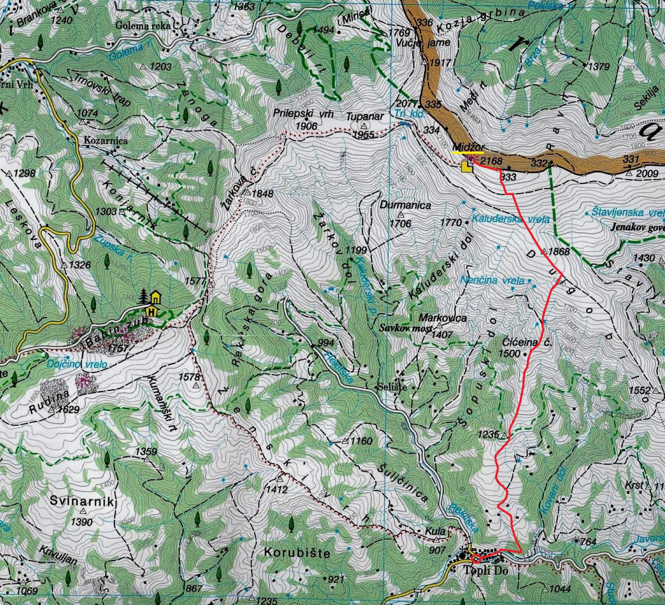 Im Dorfzentrum von Topli Do (725m) quert man das Dorf talaufwärts bis ein Pfad nach links eine Steilstufe überwindet. Dort veriert sich der Weg und man wandert weglos eine schiefe Ebene mit glatten Felsplatten hinauf, oberhalb trifft man wieder auf einen Schäferweg der weiter bergauf durch ein Waldstück führt. Auf etwa 1000m endete der Waldgürtel man steht vor dem breiten Grasrücken auf dem man nun weitere 600 Höhenmeter folgen musst. Zunächst ist wieder kein Weg mehr sichtbar, doch sobald es zum P.1235m steiler wird, ist wieder ein gutes Weglein vorhanden. Man fogt dem Graspfad, vorbei an der Kuppe Ćićeina čuka ( 1500m) bis zu einem ebene Grasvorsprung auf 1600m. Hier steigt der Pfad weier über einen steileren Grashang zum flachen, weitäufigen Rücken Dugo Bilo an wo er sich verliert. Auf dem Rücken gelangt man unter die grasige Flanke des Gipfels durch die man direkt weglos aufsteigt, dabei wird ein Weg auf 2060m. Man erreicht den Ostgrat westlich Grenzstein 333. Man folgt dem Grat zum höchsten Punkt.