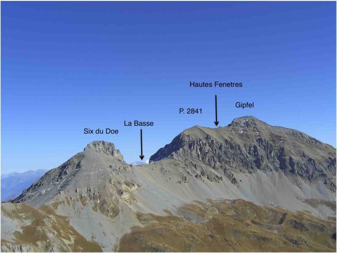 Der N-Grat weist ebenfalls Trittspuren auf, die allerdings wesentlich weniger deutlich und auch nicht durchgehend sind. Es hat auch alte Markierungen, die (gegenwärtig) oft nur mehr schwach sichtbar sind. Diese Markierungen sind sehr nützlich, weil zwei grössere Abstürze in teilweise unübersichtlichem Gelände (mehrere Sekundärgrate, div. parallele Couloirs, die ins Leere führen) abzusteigen bzw. abzuklettern sind (T5): Der erste führt vom Gipfel zu den Hautes Fenêtres (ca. 2800 m), der zweite vom P. 2841 nach Le Basse (2596 m). Generell gilt, dass man sich eher in der W-Flanke des N-Grats bewegt - ausser in den letzten ca. 100 Höhenmetern oberhalb Le Basse, wo die Route in die O-Flanke ausweicht. Schliesslich wird der Six du Doe auf Trittspuren im steilen Geröll hart unter den Felsen westlich umgangen, worauf man ca. 100 m unter dem Col de Fenestral (bzw. der Cab. de Fenestral) auf den Wanderweg trifft.