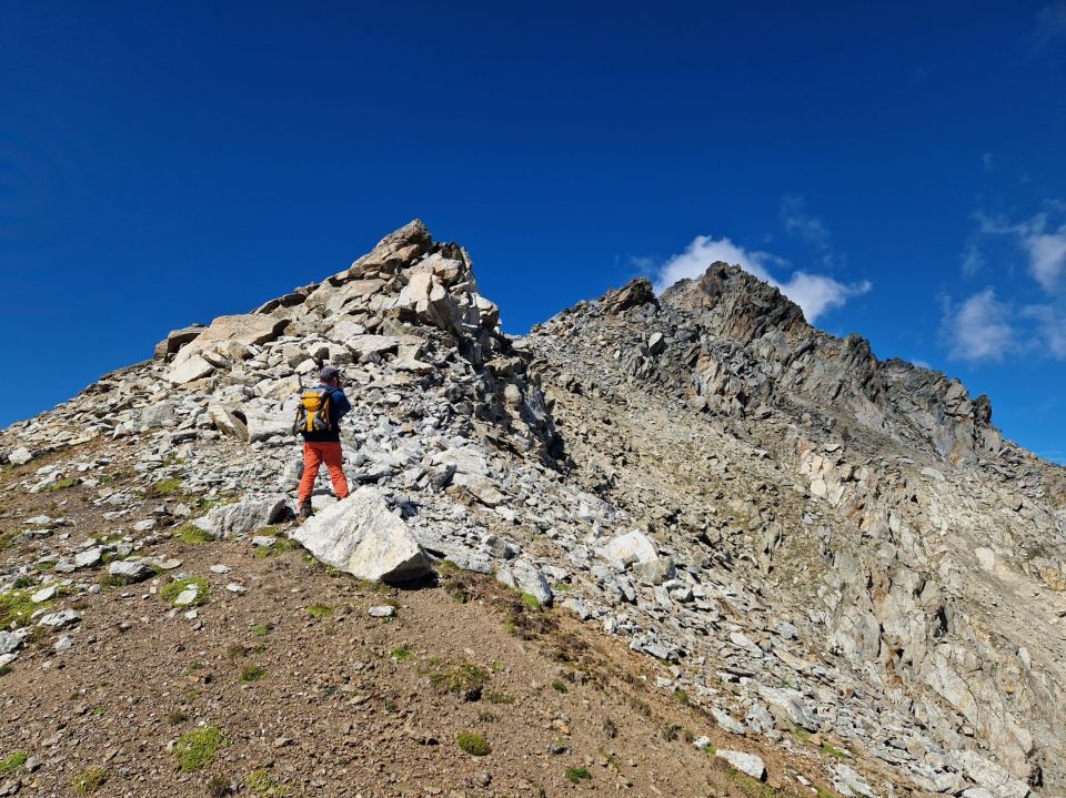 Aufstieg zur Sella da Ravais-ch auf markiertem Bergwanderweg. Von dort weglos in die Nordostflanke aufsteigen und den Ostgrat anpeilen. Auf diesem gelangt man über grosse Blöcke zum Gipfel. (ab Sella da Ravais-ch T4, am Ostgrat vor dem Gipfel T4+/I). Text mountainMäsi. SAC Clubführer Bündner Alpen 6, Route 784