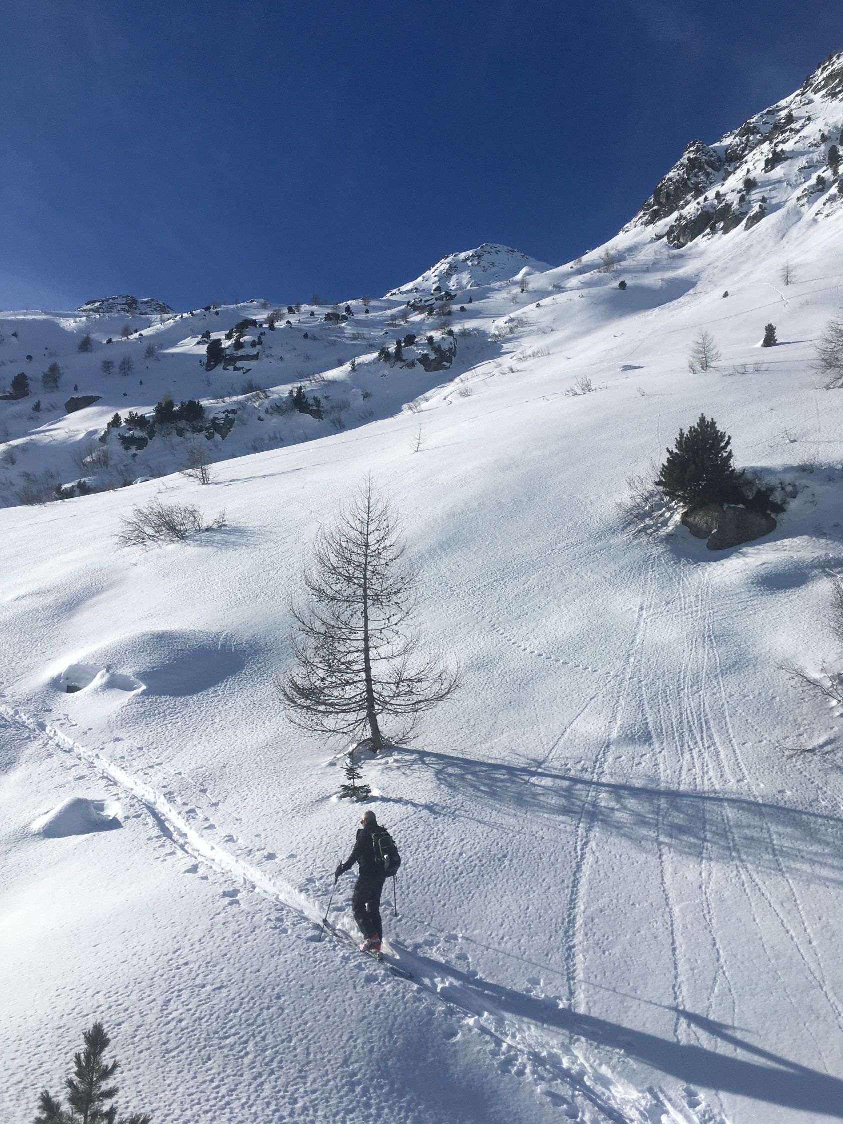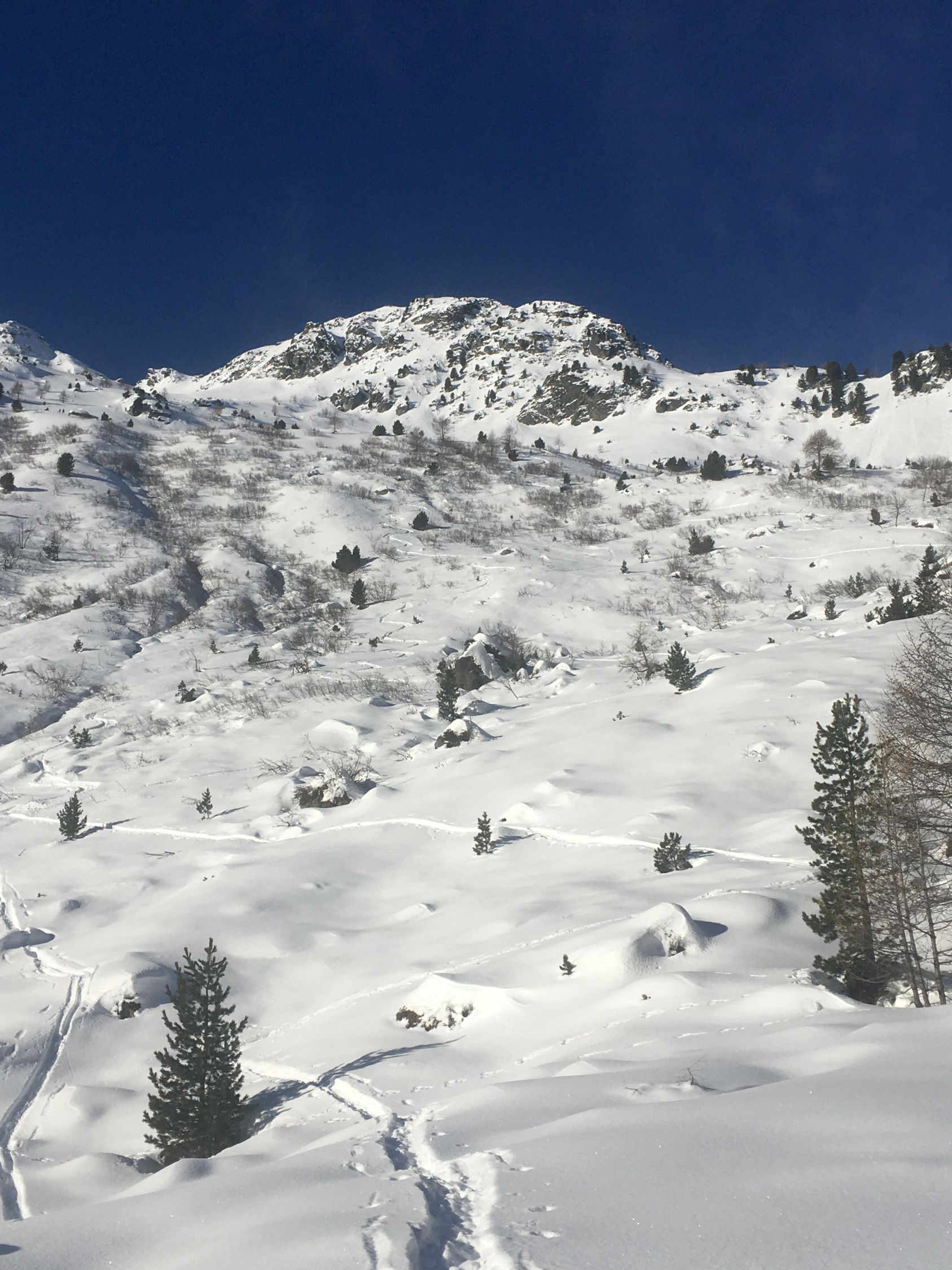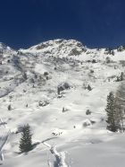 Bei ungünstiger Lawinensituation kann der Direktaufstieg zuerst über dem Bosch da Cavloc entlang dem Sommerweg Richtung Süden und weiter in einem Rechtsbogen zum Punkt 2351 umgangen werden.