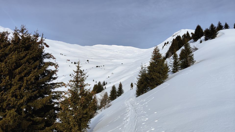 Von Calfreisen über Balnettis bis zum Punkt 1453. Weiter entlang des Grates bis zur Waldgrenze und dann Richtung Nord-Westen, in der Flanke, Richtung Gipfel aufsteigen.