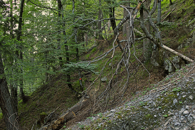 Vom Gonscherolaboden führt der Pfad erst noch im Nadelwald, der aber bald in Legföhrenbestände übergeht, ostwärts über Schutt und Schrofen empor zum Punkt 1749. Hier verflacht der Pfad und quert über eine aus den Legföhren gehauene Schneise hinüber ins oberste Eck des Gonscherolatobels.