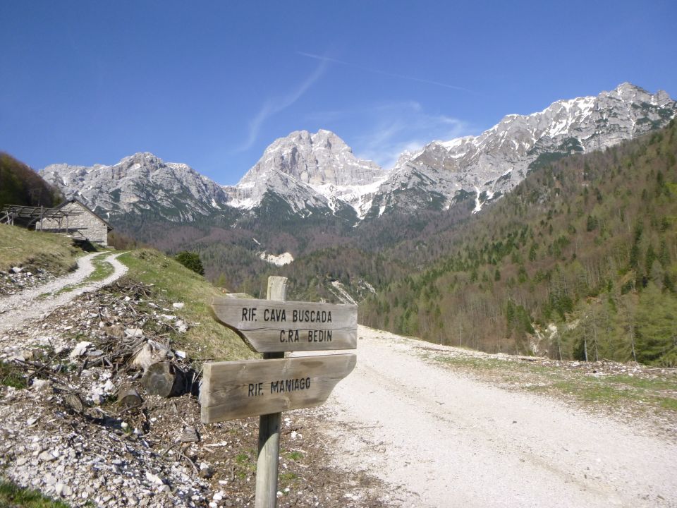 Der Forstweg teilt sich unmittelbar nach den Infotafeln. Rechts führt einer unsteil hinab in das breite Kiesbett des Zemola-Baches. Links führt der Weg nordwärts an der kleinen Casera Ferrera (1255 m) vorbei unsteil hinauf ins Val di Bozzia. Vor der kleinen Hütte biegt rechts rot-weiß signalisierter Wanderweg Nr. 374 ab, der zum breiten Kiesbett des Baches T. Zemola führt. Über eine gemauerte Furt wechselt man die Uferseite nach links, wo ein breiter befestigter Schotterweg nordwärts zum P 1203 führt und wo rechts ein Bergweg abzweigt (Wegweiser) zur Casera Galvana. Bei einem kleinen Wasser-Behälter überquert man wieder den Bach nach links (45 min.) und beginnt durch einen Buchenwald-Rücken stetig aufzusteigen, bis man obere Forstraße kreuzt. Weiter nordwärts trifft man nochmals auf diese Schotterpiste bei einer Ruine (25 min.). In 25 min. wandert man in nordöstliche Richtung links oberhalb des Duranno-Einschnitts mit seinen Geröllreißen zu einem Linksabzweig (zur Casera Bedin di sopra), wo man geradeaus bleibt. 20 min. später erreicht man die Hanglichtung mit dem Rifugio Maniago (1730 m) der CAI-Sektion Maniago. Dort gibt es einen Brunnen, der auch im Winter Wasser führt. Auf anderer Seite der Hütte steht eine kleine Kapelle. Während der Bergweg Nr. 374 zur Forcella Duranno führt, verlässt man diesen nach links. Der rot-weiß markierte Bergpfad führt hinauf und rechts um eine schräge Felsrippe herum in ein Hochkar. Über dieses nordwärts hoch zum Felsriegel, in dem man eine schräge, nach links hochziehende Rampe entdeckt (2045 m, 1 Std.). Am Felsfuß hängt ein kleines Blechschild mir der Aufschrift: „Fondazzione „A. Berti“ G.A.M. Onigo Prcorso Alpinistico „O. Zandonella“.
