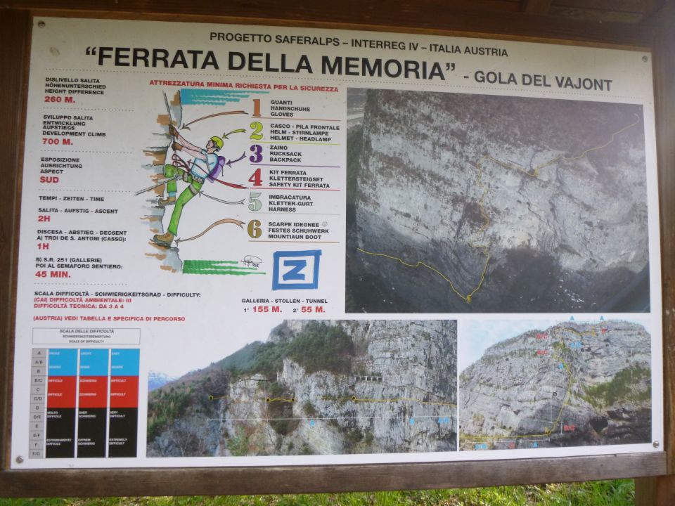 Der Klettersteig über 260 Hm wurde im Jahr 2014 gebaut, ist unterwegs laufend nummeriert und mit Höhenangabe und der Notruf-Nummer 118 gekennzeichnet. Er erinnert an das Unglück am Abend des 9.10.1963, als durch das Aufstauen des Wassers der 2 km lange Nordhang vom Monte Toc seine Stabilität verlor und 270 Mio. m3 Felsen und Sand in den Stausee rutschten und eine 200 m hohe Flutwelle auslöste, welche über die Staumauer schwappte und den im Piave-Tal liegend Ort Longarone mit 70 m Höhe überschwemmte, sowie 4 weitere Dörfer zerstörte und über 2000 Menschen den Tod brachte. Die Ursachen kann man im link von National Geographic nachschauen: https://www.youtube.com/watch?v=7oXynEXqXB8