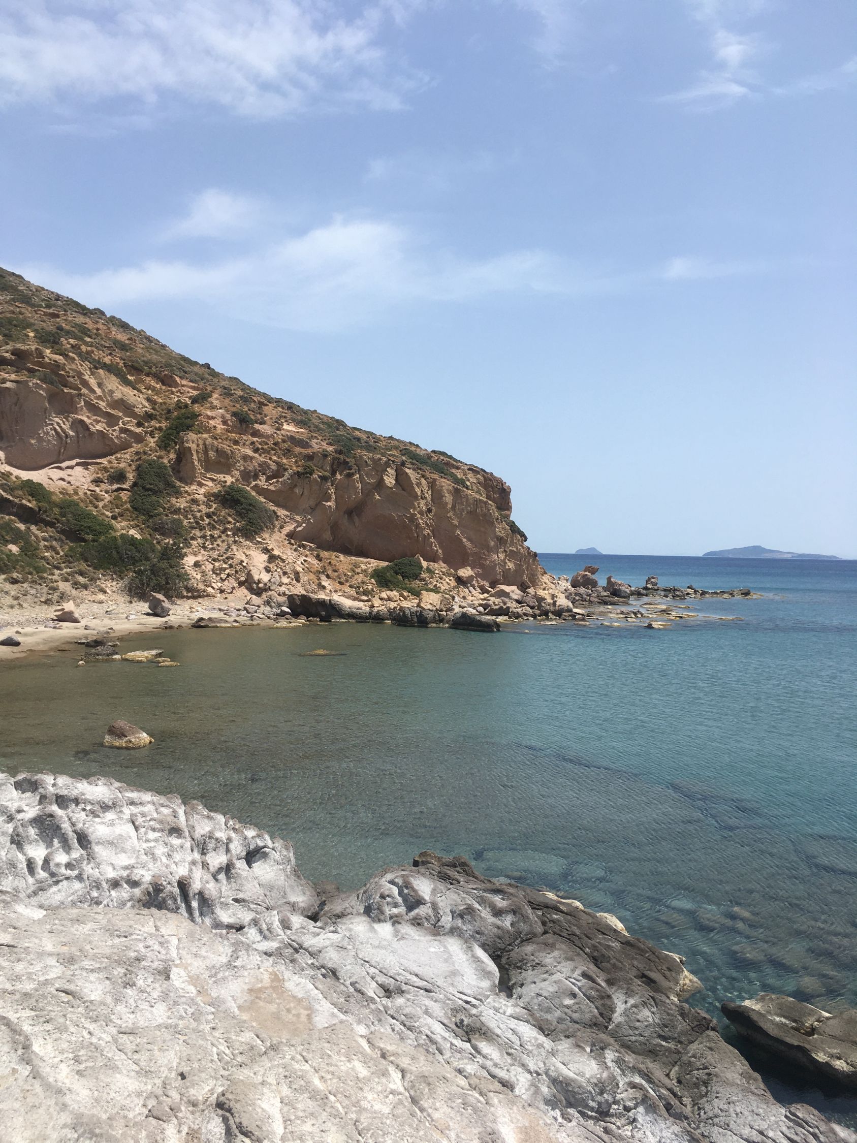 Von der Taverne Jenny die kaputte Strasse runter zum Camel Beach. Nun der Küste entlang bis zur Schlüsselstelle. Entweder kurzes Stück hochklettern (2a) oder über Gewächs auf den Felsen hoch klettern (1b) und weiter unschwierig zum Panorama Beach. Hier befindet sich ein steiler Weg zu dem Panorama Hotel. Nun auf Platten alles der Küste entlang etwa 10 Meter ob dem Meer und am Schluss unschwierig zum grossen Strand Agios Stefanos und weiter zu den Ruinen der Kirche St. Stefanos. T4-.